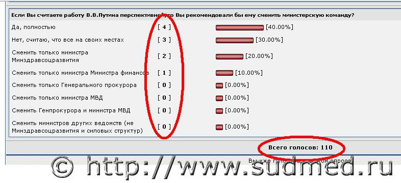 В последнем вопросе - засада: Если вы считаете работу Путина бесперспективной, то не сможете завершить опрос Кроме того, дорогой ахмед! Желательно все же не корёжить русский язык и как-то справляться с падежами прилагательных: Цитата Как Вы оцениваете правление В.В.Путина на посту Председателя правительства РФ? Поддерживаю все его начинания Считаю малозначимой Считаю перспективной Считаю бесперспективной Не задумывался Никак в подчеркнутых словах необходимо окончание "-ым" Если не секрет, в чем смысл проведения такого опроса? И еще, уважаемые модераторы, обратите внимание на скриншот: Количество распределившихся голосов не соответствует общему числу проголосовавших.  |