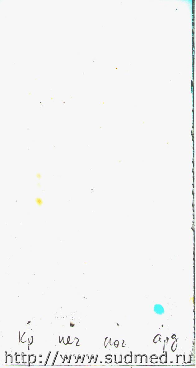 Здравствуйте! В продолжение темы... Вот две хроматограммы Система: Н-бутанол-пиридин-уксусная кислота лед.-аммиак 25% (9:6:1,8:1,8) 1. ТСХ р-в Драгендорфа по Мунье (насыщение системы 1 час) 2. ТСХ тиоцианат кобальта (насыщение системы 30 мин) Добрый день! Спасибо, за наглядность! Получилось у нас почти так же, когда опробывали методику и тестировали, чуть ниже. С Драгенд. получились еще пятна (у биологич. метериала) RF 0.5-0.55; а с тиоцианом опять же у биологического материала синие (именно синие) Rf 0.5-0.55; Rf 0.45-0.47. Стандартная кровь (без добавки), т.ж давала эти самые синие пятна. В исследуемой мы, конечно, ничего не нашли, но затравки получились на уровне (не помню), помню, что концентрацию при затравке брали токсическую или около нее от 1 до 5мкг/мл, % изолирования что-то около 30%. Надо глянуть записи. |