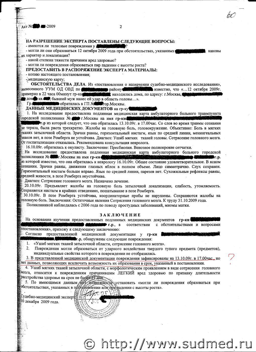1. Может ли легкая пощечина вызвать «ушиб мягких тканей головы, сотрясение головного мозга», если человек не падал, не ударялся, не терял сознания? СМЭ диагноз «ушиб м/т затылочной области» не подтвердила, почему тогда подтверждается диагноз «сотрясение головного мозга»? 2. 16 октября, через 4 дня после нанесения пощечины, в выписке из травмпункта Зам. Главного врача одной поликлиники пишет «горизонтальный нистагм», то же самое пишет невролог другой поликлиники, основываясь на предыдущей выписке, а при осмотре у врача-офтальмолога в третьей поликлинике того же дня «горизонтальный нистагм» отсутствует. О чем это свидетельствует? 3. Достаточно ли неспецифических симптомов: тошнота, рвота, головокружение - для постановки диагноза «сотрясение головного мозга» врачом травмпункта? Могут ли эти симптомы быть признаками других расстройств здоровья, нарушений работы других органов и таким образом привести к ошибочной постановке указанного диагноза? 4. Диагноз поставлен врачом травмпункта со слов пациента, которые являются заведомой ложью при наличии веского мотива (вымогательство недвижимости). Можно ли ставить диагноз «СГМ» с таких слов, без проведения специального обследования (ЭХО-ЭГ, УЗИ, рентгенограммы, томографии)? 5. Диагноз «Ушиб мягких тканей головы. Сотрясение головного мозга» поставлен в травмпункте на следующий день после нанесения пощечины, 13 октября 2009г. в 17.00 (указано в выписке, сделанной Зам. Главного врача поликлиники). Можно ли утверждать, что не имеется данных (обстоятельств), которые могли бы исключить возможность возникновения данного диагноза за промежуток времени с 20:00 12.10.2009 до 17:00 13.10.2009г.? 6. «Поза Ромберга» и статическая атаксия – одно и то же? Если нет, в чем их принципиальное различие? Когда может возникнуть неустойчивость в позе Ромберга? Достаточно ли результатов КП в позе Ромберга для выведения заключения «стато-динамическая атаксия» и постановки диагноза «ЗЧМТ: сотрясение головного мозга»? 7. В амбулаторной карте к общей записи врача имеется приписка «в позе Ромберга неустойчива», сделанная другими чернилами и другим почерком. Могла ли данная приписка в карте способствовать подтверждению диагноза «Ушиб мягких тканей головы. Сотрясение головного мозга» в выписке, сделанной Замом главного врача? На лицевой стороне выписки после формулировки стоит знак вопроса (?) 8. Что такое менингиальные знаки? Можно ли при записи «менингиальных знаков нет» ставить диагноз «сотрясение головного мозга»? 9. Причины возникновения горизонтального нистагма? Может ли нистагм быть вызван вследствие изменений сетчатки глаза, изменений сосудистой оболочки? 10. В 2005г. офтальмологом был поставлен диагноз «Ангиоспазм сетчатки». Может ли данный диагноз 2005г. и диагноз «ангиопатия сетчатки» в 2009г. сопересекаться и способствовать возникновению «горизонтального нистагма»? 11. Может ли диагноз «венозное полнокровие сетчатки обоих глаз» быть признаком сотрясения мозга? Либо это симптом гипертонии или высокого внутричерепного давления? 12. Можно ли подтверждать диагноз «ЗЧМТ: сотрясение головного мозга» на данных клинико-неврологического наблюдения: горизонтальный нистагм, легкая стато-динамическая атаксия – с учетом названных моментов, вызывающих сомнение? 13. Единственное обследование - ЭХО-ЭГ было проведено 17.10.2009г. через 5 дней