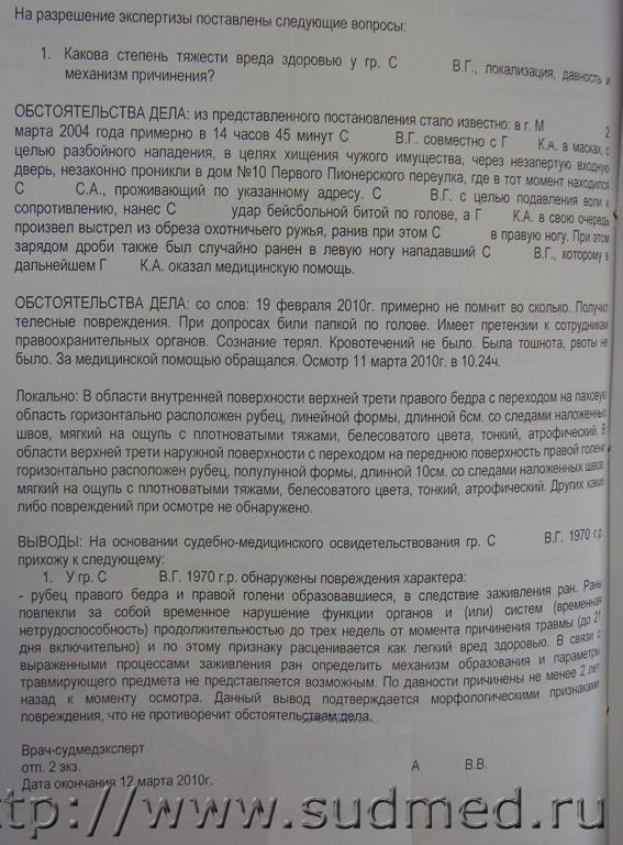 Вопросам предшествует изложение обстоятельств дела. Будте добры изложить. Кратко: -03.2004г. - в 14.40 происходит нападение на предпринимателя. Нападают двое в масках. Один с обрезом, второй с битой. Который с обрезом стреляет в пред-ля и три дробины попадают в левую ногу второму(который с битой). - в 15.10 Который с обрезом делает лезвием глубокий разрез на ноге второго желая вытащить дробь. Задевает артерию. - в 24.00 Который с обрезом вытаскивает дробь и зашивает нитками место разреза. (подробности в "Эскизы прикрепленных изображений"- показания того который с обрезом) - 03.2010г. - доблестная мил. находит того, который с обрезом. Тот называет второго. Берут этого второго и находят шрам на правой ноге. Экспертизу проводили визуально. Шрам этот от ножевого ранения. В книге А.Ф. Лисицына "Судебно-медицинская экспертиза при повреждениях из охотничьего гладкоствольного оружия" прочитала, что при ранениях дробью проводят рентгенологическое и гистологическое исследование. Что после ранения остаются следы металла, а также "дробовые повреждения сопровождаются метахромазией и гомогенизацией тканевых элементов со значительным набуханием и утратой ими характерной структуры". Вопрос: Из-за давности лет (давность 6 лет) покажет ли рентгенологическое исследование - следы металла и гистологическое - дробовое повреждение? |