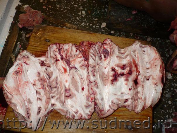 Учитывая представленные краткие сведения о пути мужика в морг с места его обнаружения и виды на представленных фото можно придти к следующему: 1. прошел достаточный срок для заживления повреждений (2 недели), и вполне возможно что часть их ко времени исследования утрачена ; 2. исследование одежды в данном случае не даст сведений о механизме формирования ЧМТ, хотя само исследование одежды быть должно проведено; 3. медико-криминалистическое исследование изъятого свода черепа (при отсутствии значительной части фрагментов, удаленных на операции) не принесёт ожидаемого результата; 4. судя по видам повреждений, составляющих комплекс ЧМТ- данная травма могла возникнуть при сдавлении головы в боковом направлении (при фиксации головы на её правой боковой поверхности- правая височная область и действии травмирующего предмета в левую лобно- височную область) - а уж данный механизм мог быть при различных обстоятельствах; 5. образование ссадин произошло- ну это всем известно- в результате действия травмирующего предмета под острым углом к поверхности кожи описанных областей . |