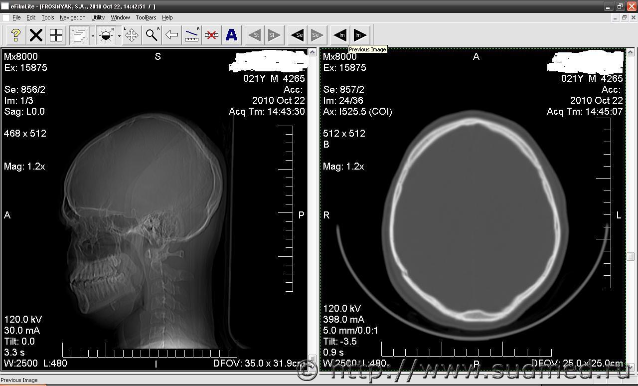 перелом костей черепа, КТ |