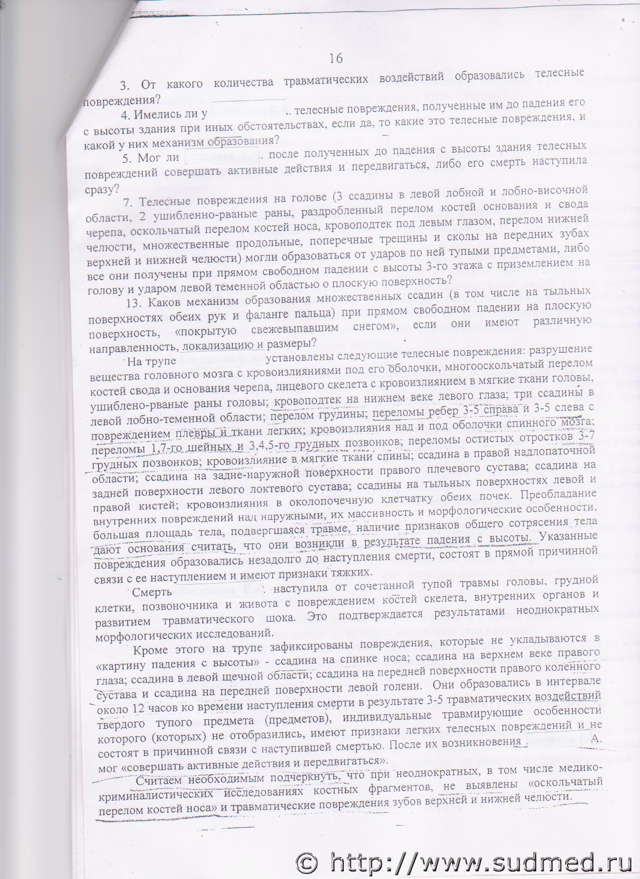 На основании представленных материалов первичной судмедэкспертизы трупа и выводов повторных комиссионных судмедэкспертиз, а также обстоятельств дела, при этом ни в коем случае не злоупотребляя свободным от основной работы временем судмедэкспертов, просьба ответить на следующие вопросы: 1. Какова вероятность образования кровоизлияний и кровоподтеков описанных в выводах повторной судмедэкспертизы эксгумированного трупа (кровоизлияния в желудочки головного мозга; кровоизлияния под мягкую мозговую оболочку обеих полушарий мозжечка; кровоизлияния под твердую мозговую оболочку в теменно-затылочных областях; кровоизлияние в кожно-мышечный лоскут головы височно-теменно-затылочной области слева; ссадины и кровоподтек на голове; кровоизлияние под твердую мозговую оболочку спинного мозга на уровне 2-5 грудного позвонка; кровоизлияние над твердой мозговой оболочкой на уровне 1-7 грудного позвонка; кровоизлияния в мышцы спины на уровне 7-шейного -8 грудного позвонка; кровоизлияния в области перелома рукоятки грудины и боковой поверхности грудной клетки слева; кровоизлияния в околопочечную клетчатку обеих почек; кровоизлияния в мягкие ткани боковой поверхности туловища слева; кровоподтек нижнего века левого глаза) в случае, когда кровяное давление падает резко практически до нуля, при обширной открытой ЧМТ с выпадением фрагментов мозгового вещества? 2. Какая вероятность в данном случае образования морфологических признаков травматического шока? (распространенные нарушения кровообращения в головном и спинном мозге с микротромбами, периваскулярными геморрагиями, ишемией нервных клеток, отеком; распространенный спазм артерий и венозное полнокровие внутренних органов с депонированием крови в сосудах микроциркуляции; шунтирование кровотока в надпочечниках, печени, поля шоковых клеток в печени; очаговый отек, острая эмфизема легких; дистрофические изменения внутренних органов). 3. Какова вероятность образования всех повреждений имеющихся на трупе от одного травматического воздействия при прямом свободном падении с высоты 3-х этажного дома? 4. Могла ли иметь место в данному случае комбинированная травма с интервалом 0-6 часов? P.S. Вялiкае дзякуй Админу за честный, прямой ответ. При проведении полноценного экспертного исследования готов сотрудничать не "за спасибо". |