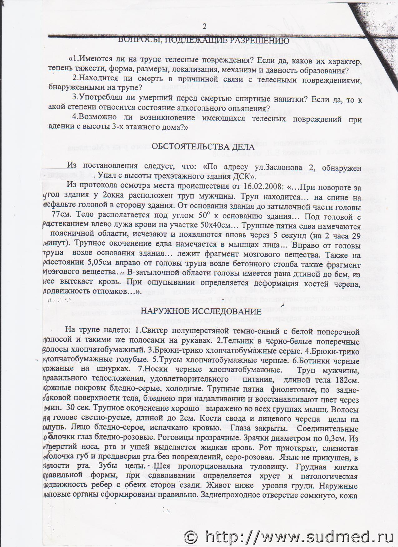 2. Выложите полный текст протокола первичного вскрытия. 3. Изложите обстоятельства дела, в частности, уточните - проезжают ли в месте падения грузовые автомашины. |