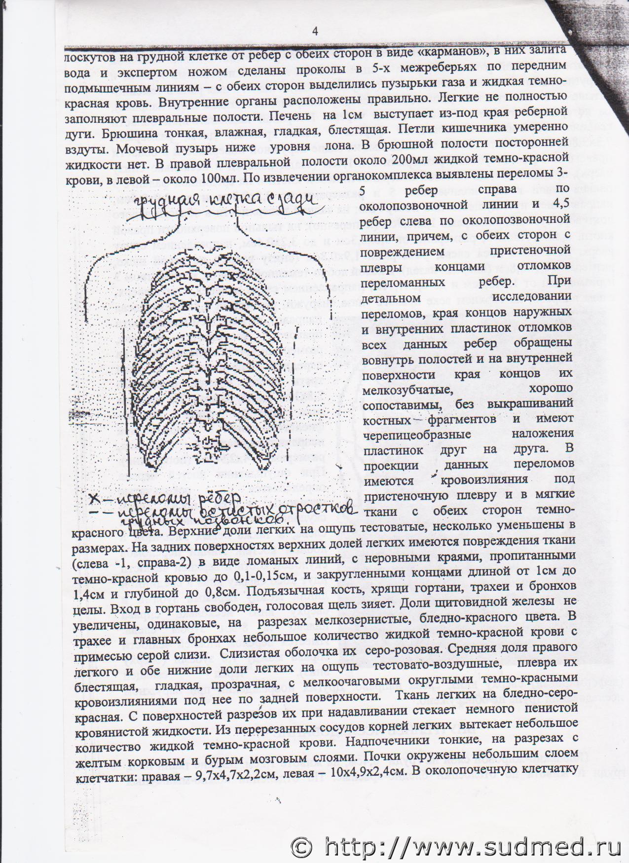 1. Перелом 3-го левого ребра по околопозвоночной линии является полным, конструкционным, сгибательным и мог образоваться в результате сгибания ребра при действии травмирующей силы на отдалении. 2. Перелом 3-го правого ребра по окологрудинной линии является неполным компрессионным и мог образоваться в результате смещения переднего конца ребра в сторону заднего со стороны его верхнего края. 3. Неполный перелом 4-го правого, полные переломы 4-го левого и 5-го левого ребер по околопозвоночным линиям являются конструкционными, разгибательными с элементами спиралевидности и могли образоваться в результате разгибания ребер, при действии травмирующей силы в передне-заднем направлении с одновременным кручением переднего конца в направлении снизу вверх и несколько изнутри кнаружи, при фиксированном заднем конце ребра. 4. Перелом 5-го правого ребра по околопозвоночной линии является полным конструкционным, разгибательным и мог образоваться в результате действия травмирующей силы на отдалении, т.е. на передний конец ребра в направлении спереди назад. 5. На передней поверхности рукоятки грудины по краю поверхности сочленения выявлен краевой перелом, который мог образоваться в результате непосредственного воздействия травмирующей силы на переднюю поверхность рукоятки у нижнего края ее, в направлении снаружи внутрь и несколько сверху вниз. |