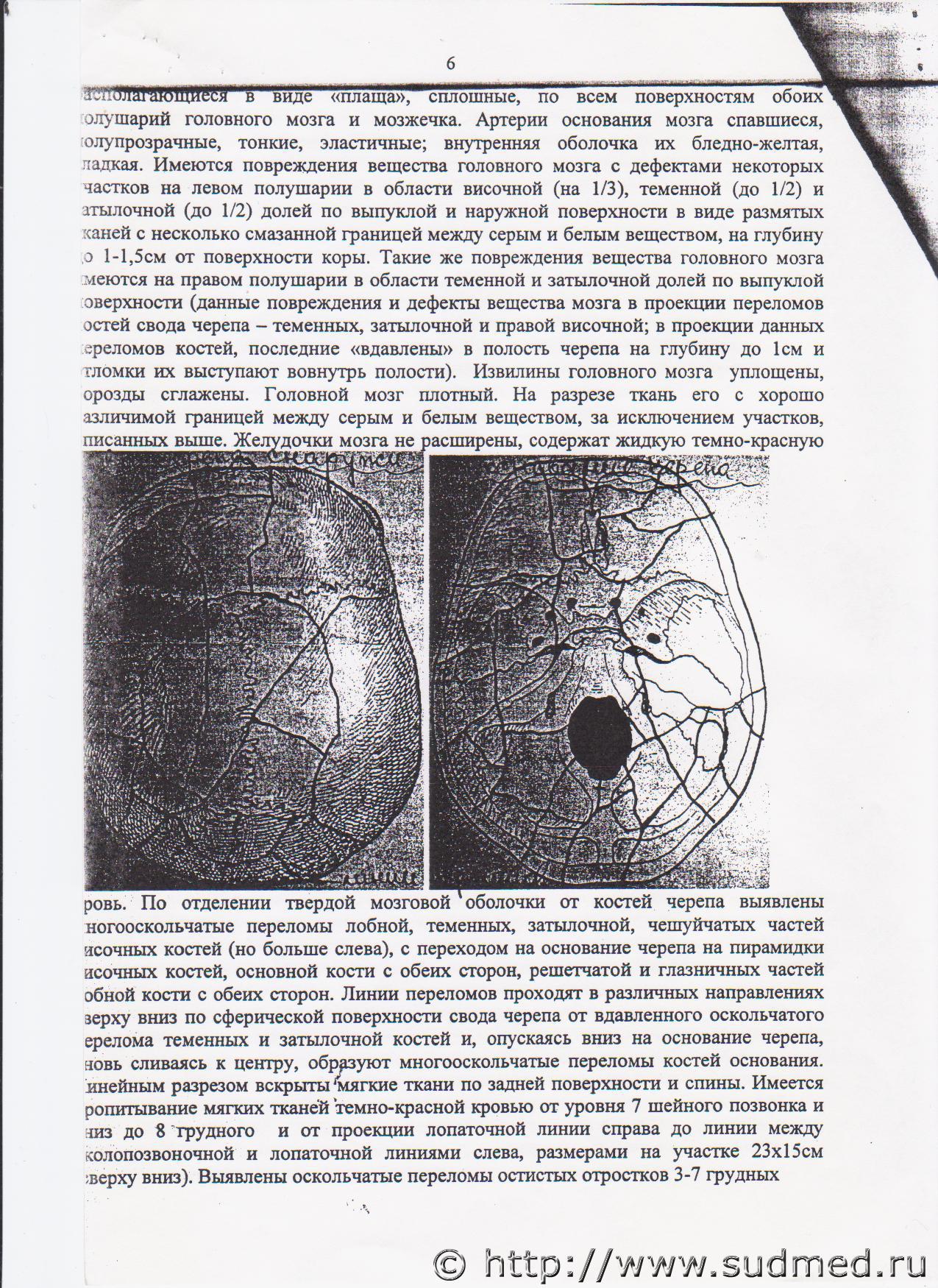 1. К каким заключениям пришли повторные комиссии? 2. Выложите полный текст протокола первичного вскрытия. 3. Изложите обстоятельства дела, в частности, уточните - проезжают ли в месте падения грузовые автомашины. На 1 и 2-й вопросы прилагаем заключения с кратким изложением обстоятельств дела. Из материалов проверки: "... Я услышал глухой удар. Вышел на улицу, увидел лежащим на земле мужчину. Я увидел, что из головы мужчины идет кровь. Каких-либо признаков жизни мужчина не подавал. После этого я позвонил по телефону 103 и сообщил о случившися". Из карты вызова СМП: "... Время приянтия вызова - 0.44. Выезда на вызов - 0.45, прибытия на место -в 0.55.... В 0.55 осмотрен труп мужчины. при осмотре обнаружена обширная ЧМТ...., отсутствие сердечной деятельности, артериального давления нет на крупных сосудах, реакции зрачков на свет нет... Констатирована смерть от обширной ЧМТ". Для информации: из направления на медосмотр - вредные условия: работа на высоте, вибрация, пыль, шум. Из характеристики рабочего места: по окончании работы дозировщик производит очистку бетоносмесителей, раздаточных телег, вагонеток от остатков бетонной смеси. По имеющейся не подтвержденной документально информации, потерпевшего придавило вагонеткой от неумышленного включения линии по приготовлению бетонной смеси. О чем неоднократно указывали родители погибшего в своих обращениях в правоохранительные органы. Для достоверности информации прилагаем фотоснимки костных останков. 1. К каким заключениям пришли повторные комиссии? 2. Выложите полный текст протокола первичного вскрытия. 3. Изложите обстоятельства дела, в частности, уточните - проезжают ли в месте падения грузовые автомашины. Дополнительно к ранее отправленному сообщению направляю протокол первичного вскрытия. В месте падения грузовые автомашины не проезжают. 1. К каким заключениям пришли повторные комиссии? 2. Выложите полный текст протокола первичного вскрытия. 3. Изложите обстоятельства дела, в частности, уточните - проезжают ли в месте падения грузовые автомашины. Дополнительно направляю остальную часть протокола первичного вскрытия. Эскизы прикрепленных изображений |
