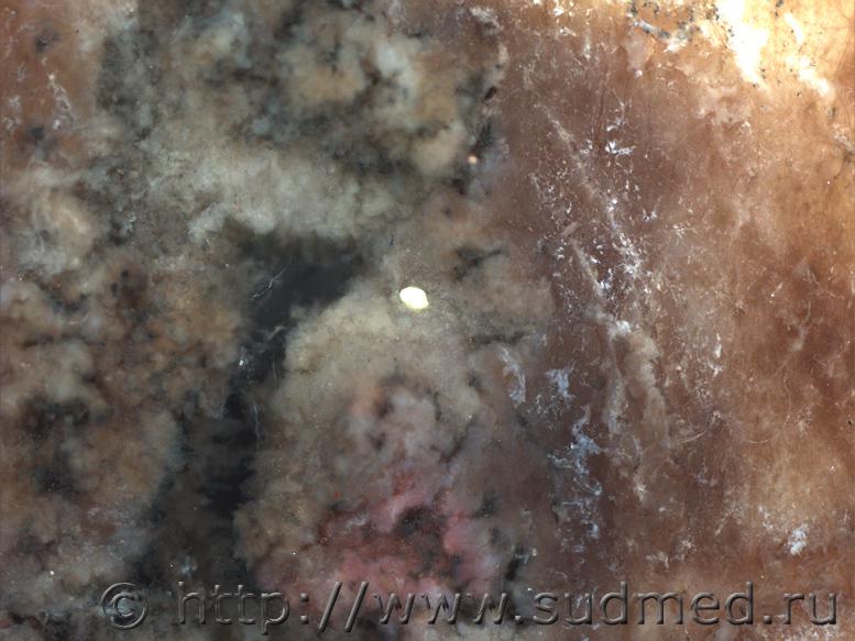 - микрофото раны с внедрившимся в край фрагментом пластмассы: - прицельное микрофото фрагмента пластмассы в краю раны: - наложение выскоинтенсивных белых фрагментов на поверхности кожного лоскута При исследовании на сурьму кожного лоскута методом цветных отпечатков обнаружено высокоинтенсивное отложение сурьмы в окружности входной огнестрельной раны. Вообще честно признаться по началу сам сомневался что возможно причинение сквозного ранения при выстреле таким типом патрона, но сомнения развеялись после микроскопического исследования раны. При изучении имевшейся литературы описания подобных случаев мне не встретилось. Надо полагать что совокупность следующих факторов дало возможность формированию данного повреждения: - короткий ствол автомата, не позволивший в достаточной мере ферментироваться пуле-имитатору; - отсутствие насадки для стрельбы холостыми патронами (гильза кстати осталась в патроннике, так как не хватило энергии пороховых газов для перезаряжания и выброса гильзы); - плотный упор; - выстрел в живот. |