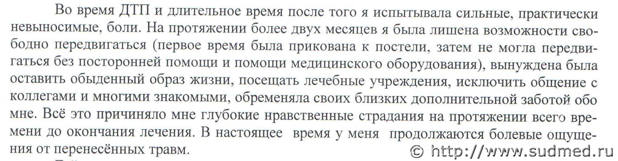 При некоторых видах травм допускается объединять повреждения в единый комлекс и оценивать его по наиболее тяжелому повреждению. Это традция сохранившаяся со времен "старых" правил. Перелом крыла подвздошной кости вызвает расстройство здоровья на срок более 3х недель. Чо касается страданий пострадавшей - решение принимает только суд. Данный вопрос вне компетенции СМЭ. |