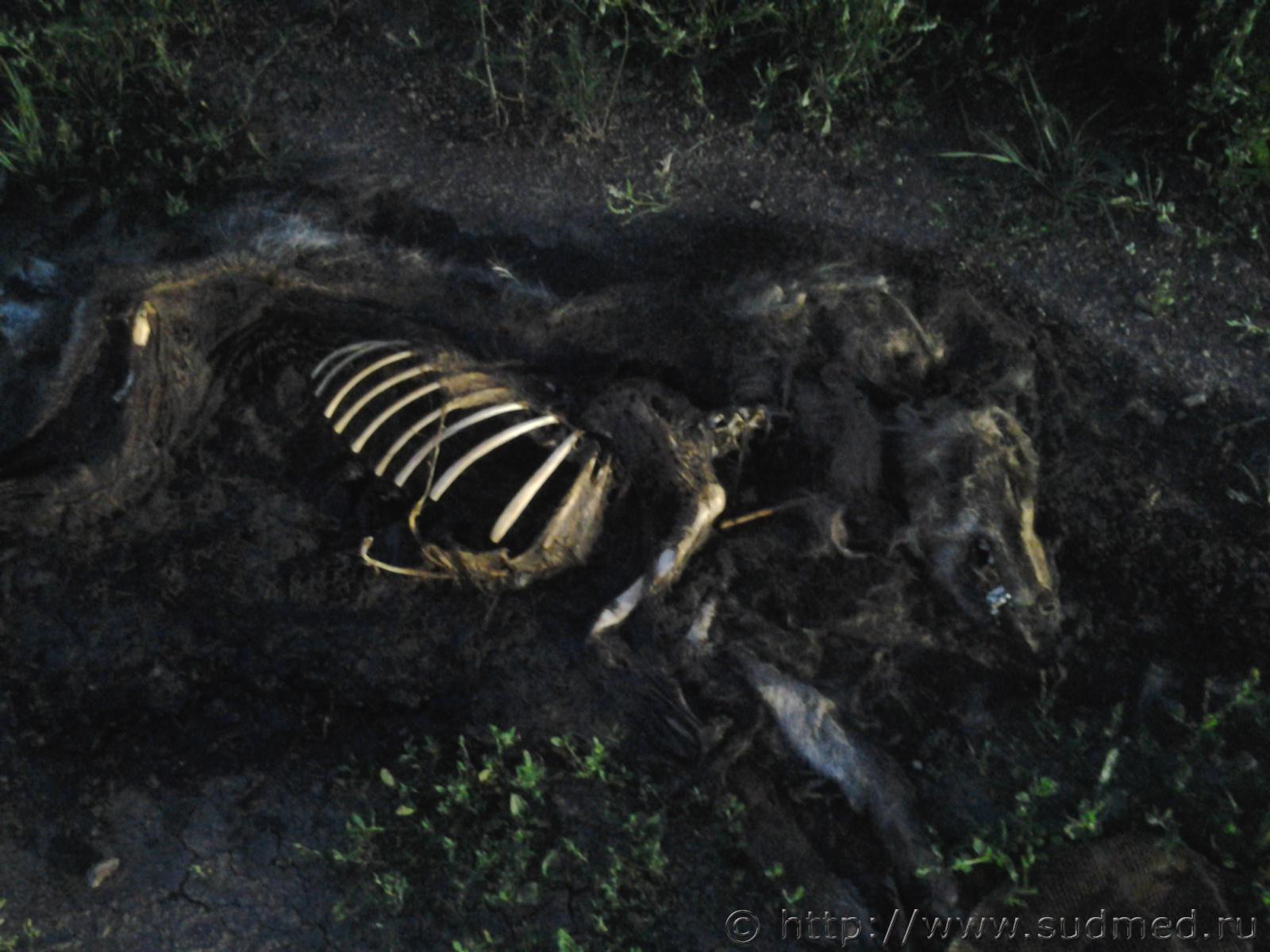 Вообще-то здесь Форум судебно-медицинских экспертов, а не судебно-ветеринарных[u] экспертов. Я не специалист, но из СМ-литературы следует, что за лето труп на грунте под воздействием внешних явлений в том числе и местной фауны может скелетироваться полностью.