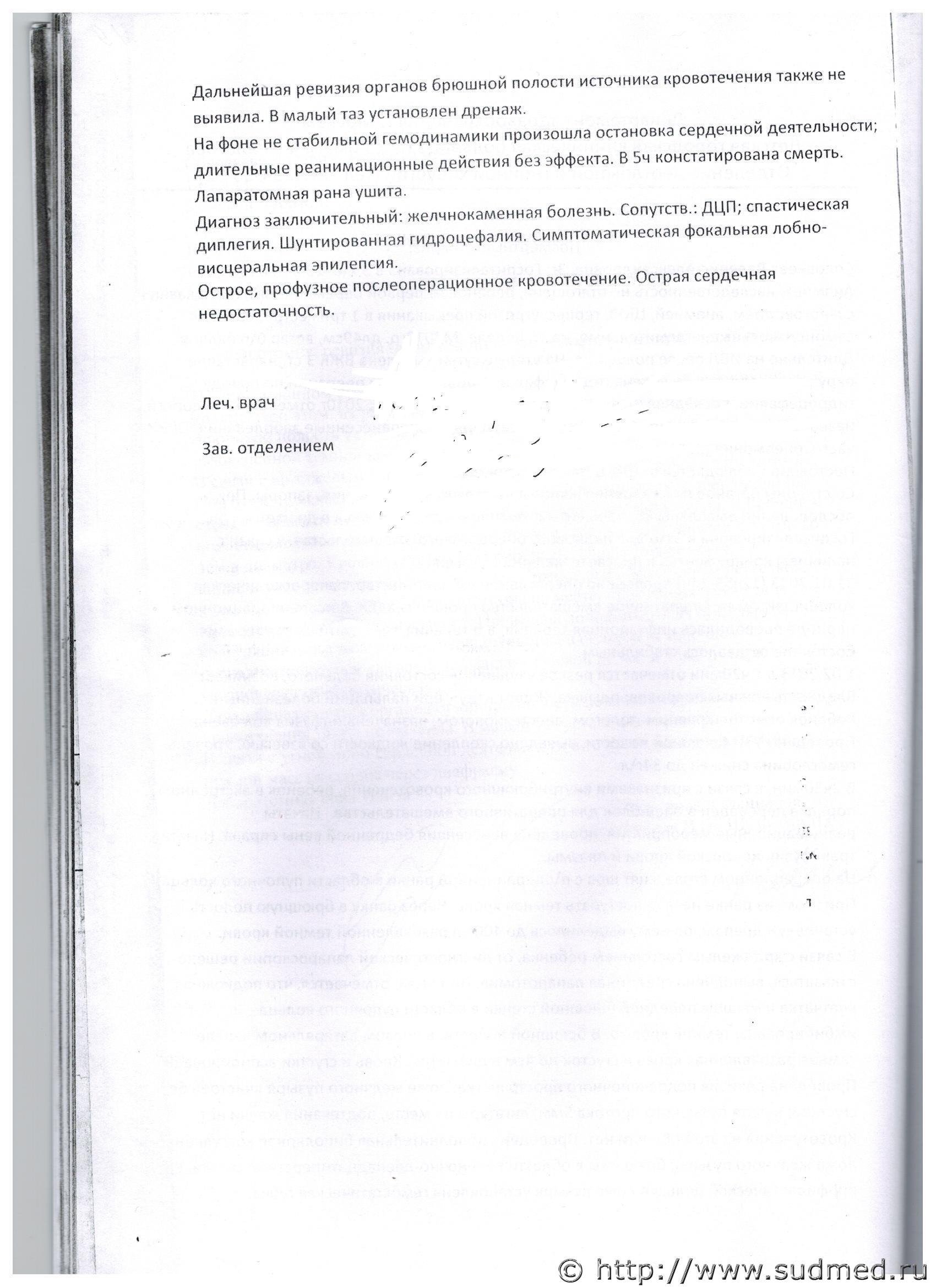 Еще есть история болезни ,протокол операции ,посмертный эпикриз. Если нужно я пришлю. У меня вопросы ОТКУДА ВОЗНИКЛО КРОВОТИЧЕНИЕ? ЕГО ПРИЧИНЫ? КАК ДОЛГО ОНО МОГЛО ПРОДОЛЖАТЬСЯ ЧТО БЫ ПРИВЕСТИ К СМЕРТИ? |