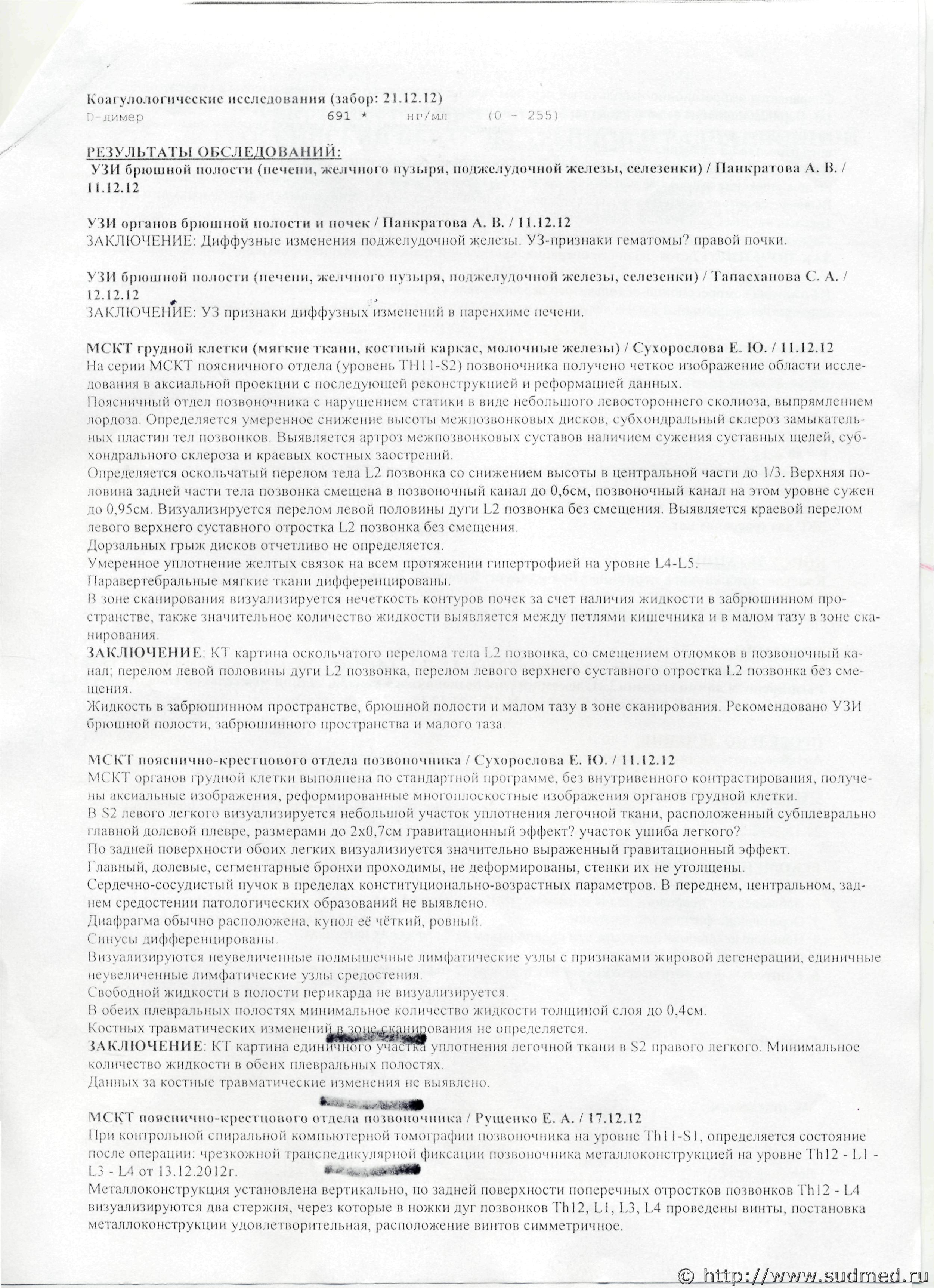 В результате диагноз оскольчатый компрессионный перелом тела позвонка L2. Сделано 2 операции поставили всякие железки и заменили ( поставили мышь) хрящ между позвонками. До сих пор она на больничном уже более 120 дней в июне будут снимать какието железки т к говорят что позвонки не работают. Извените я не медик и может быть что то пишу не правильно. Вчера я узнал что заключение судмедэкспертизы-средняя тяжесть. Заключение еще не видел но не согласен с ним полностью. Вообще возможна инвалидность. Пожалуйста подскажите что делать? |