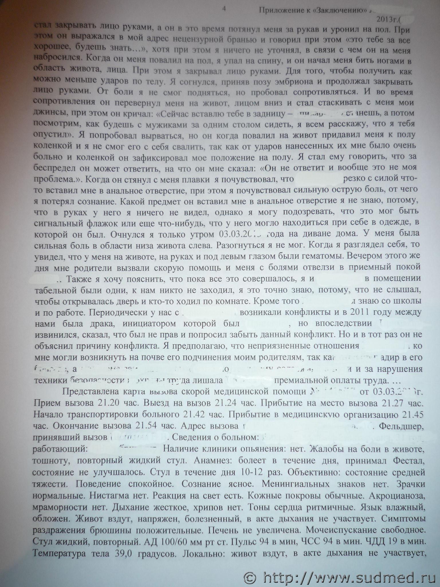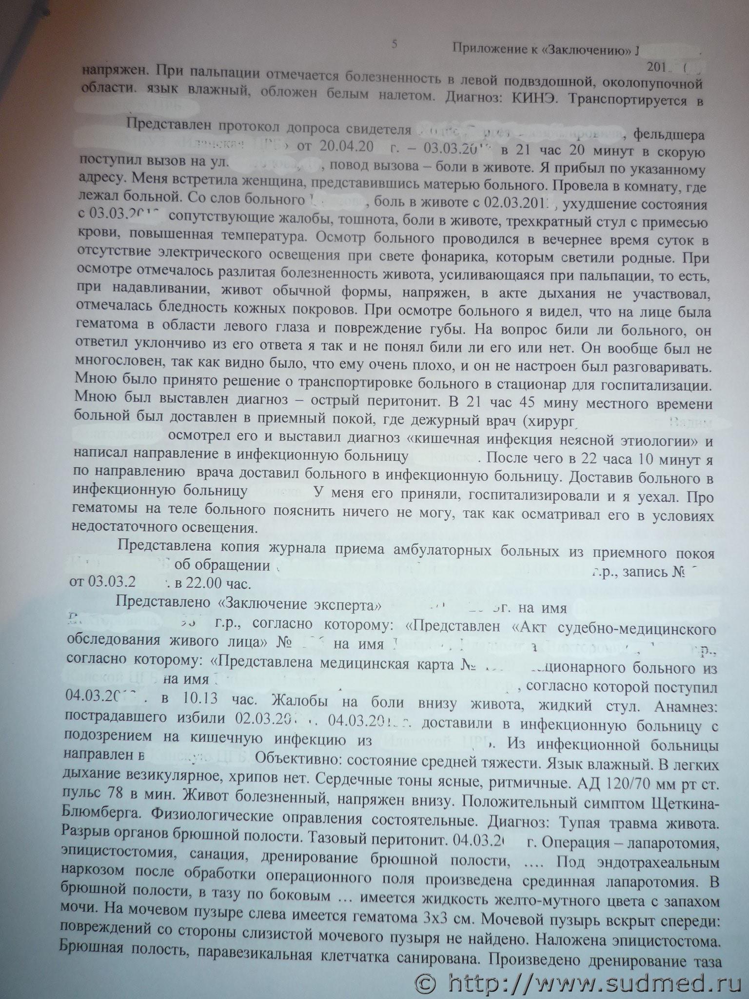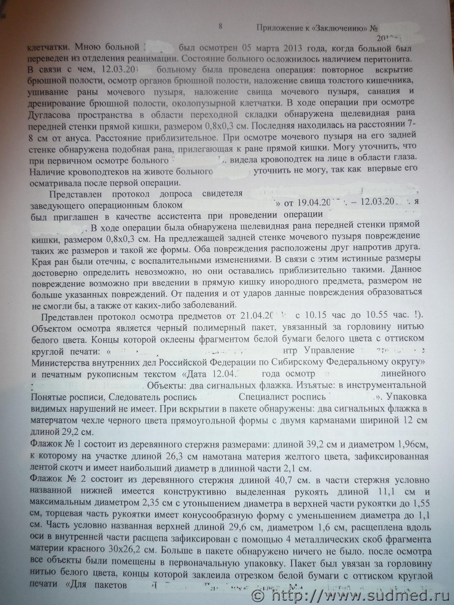 Здравствуйте. Помогите пожалуйста разобраться. Коротко: 02.03.13 выпивали, 03.03.13 заболел живот, жидкий стул, на скорой доставили в больницу, при осмотре ректально и пальпировано хирург ничего не обнаружил, отправил в инфекцию, 04.03.13 делают операцию, диагноз-тупая травма живота, ушиб, гематома мочевого пузыря слева, мочевой пузырь вскрыт спереди, повреждений со стороны слизистой м\п не найдено, послеоперационный период протекает нормально, 11.03.13 состояние средней тяжести, вводят резино-марлевый дренаж с левомеколем и вновь введен катетер Фолея, 12.03.13 вторая операция, обнаруживают щелевидную рану передней стенки прямой кишки, размером 0,8х0,3 см при ревизии мочевого пузыря обнаруживают щелевидную рану таких же размеров, суд.мед эксперт сделал вывод, что это могло произойти от введение в анальное отверстие твердого тупого предмета 02.03.13г (при этом анус не поврежден), далее в экспертизе появляется сопутствующий диагноз-повреждение задней стенки уретры. Мог ли человек с диагнозом ранение прямой кишки проникающее в брюшную полость с повреждением задней стенки мочевого пузыря. Разлитой каловый, мочевой перетонит прожить со 02.03.13 по 12.03.13г? при этом ни 04.03.13, ни 12.03.13 при ревизии брюшеной полости каловых масс и мочи не обнаружено, а только жидкость с запахом кала и мочи обнаружена 12.03.13(при второй операции) со слов врача. В экспертизах не описаны морфологические свойства и характер раны. Помогите пожалуйста разобраться, мы никак не можем добиться комиссионной сложной судебно-медицинской экспертизы. ____________ |