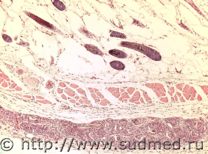 Под SMAS некое новообразование, которое можно принять за гранулему, но в реалии там имеет место гиперплазия эпителия наружного корневого эпителиального влагалища и наблюдается рост единичных волос в нехарактерном месте. Попадание в эту область волос в качестве инородных тел исключен. Это какая то опухоль придатков кожи? У кого есть иное мнение? На 1 фото представлен рост волос в норме Далее представлены микрофотографии выше описанной структуры при увеличении х100, х200 и х400 Может быть анамальный рост волоса при деформации фолликулов и врастание волоса не выходя из толщи кожи в подкожное пространство? |
