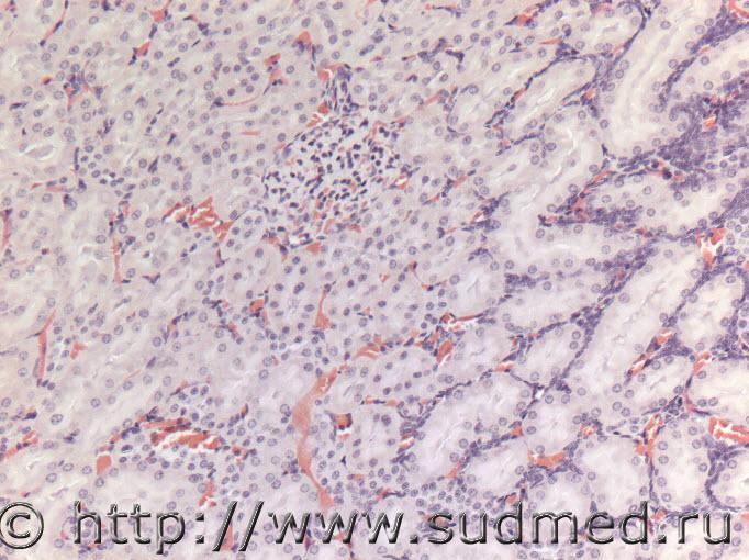 Почитав литературу, пришла к выводу, что это, вероятнее всего, интерстициальный лекарственный нефрит. Ув.Надежда Ивановна! Я вижу пролиферацию фибробластоподных клеток с овоидными, веретеновидными ядрами с ядрышками в виде соли и перца. За воспаление обычно принимаем клетки из крови в виде лейкоцитов с примесями моноцитов ,серозной жидкости с выпадением нежных фибринов( в фазе альтерации с переходом в экссудации)т.к. лейкоциты выделяют цитокинов (медиаторов воспаления) и приводит к сосудистой(полнокровия) мезенхимальной реакции(отек, клеточная инфильтрация). Все 3 фазы воспаления проходит поэтапно и я по рисунку не вижу этих изменении, кроме пролиферации.В данном случае (мое мнение) после приема препаратов происходит пролиферация и это уже тревожно. |