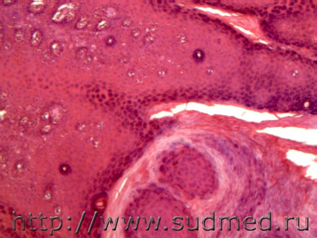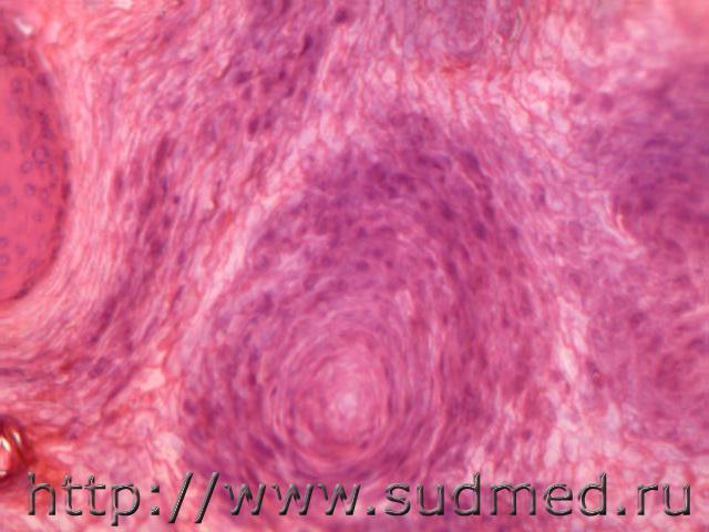 Остановился бы на плоскоклеточной папилломе с ороговением. Наиболее частая локализация ( голова,волосистая её часть),морфологические особенности опухоли на фото исключают кистозную эпителиому (пролиферирующую эпидермальную кисту). На некоторых фото срез прошёл перпендикулярно "сосочкам",по этой причине и "картинка" такая. Спасибо большое ув.Медик за консультацию! |