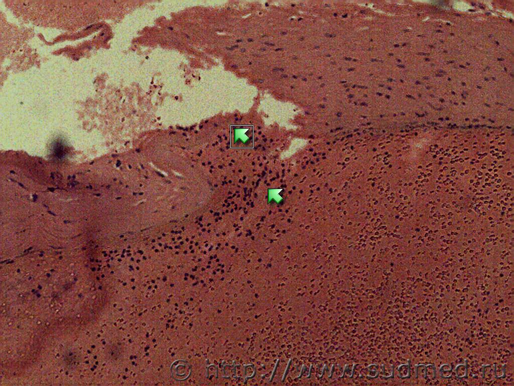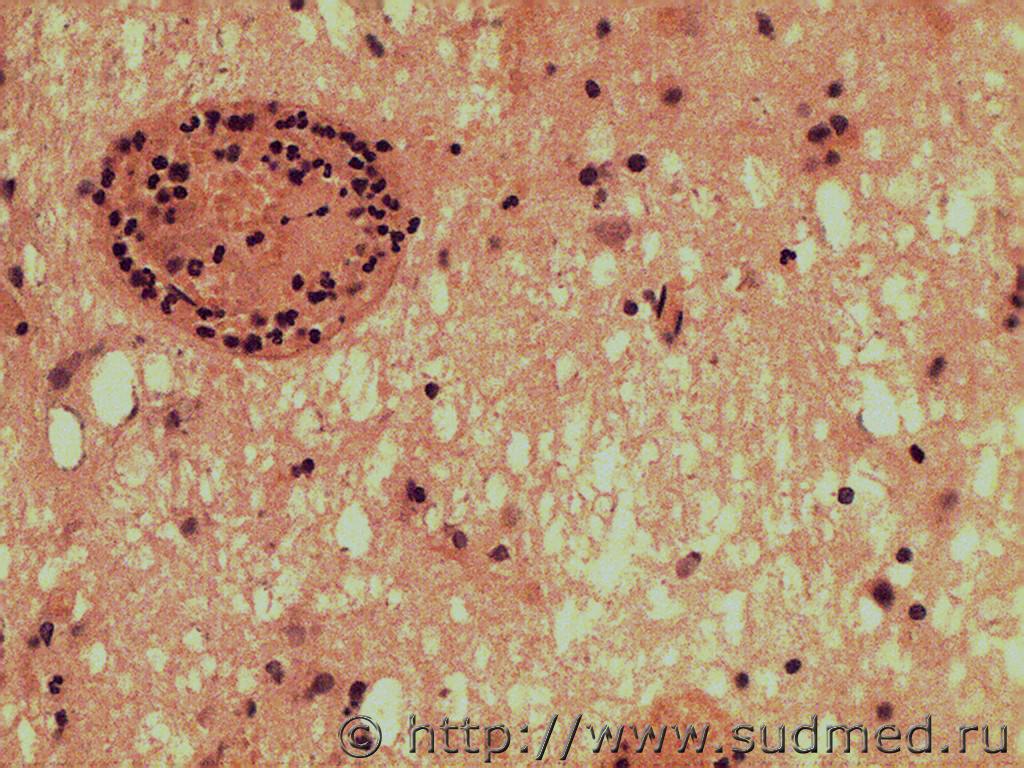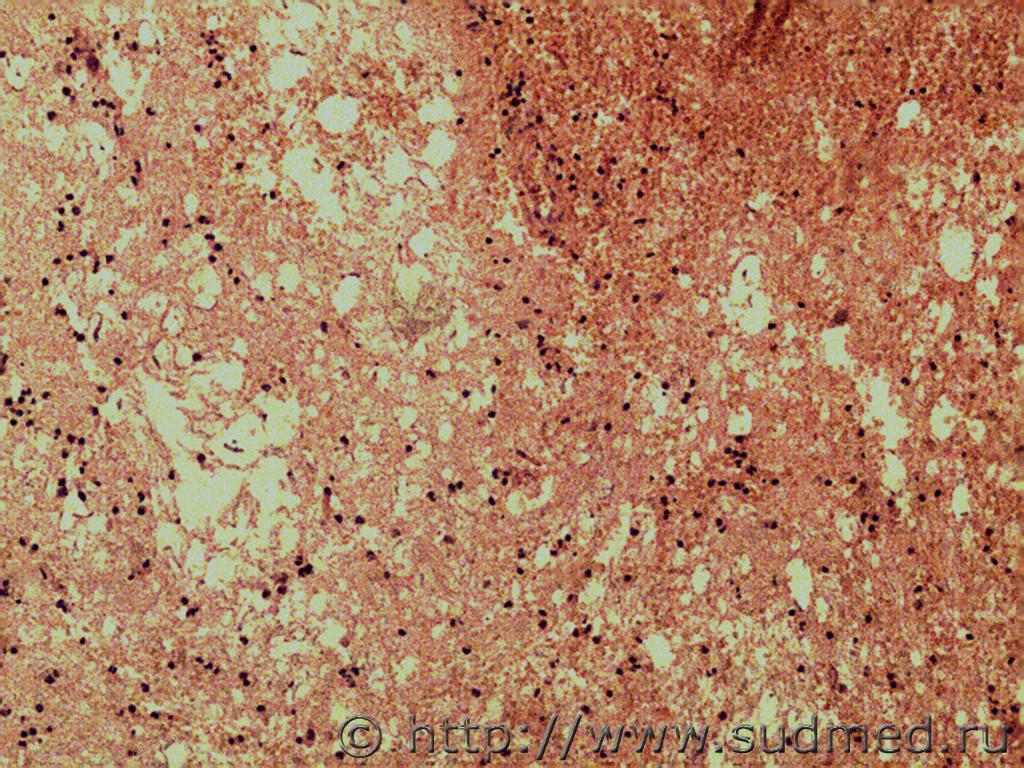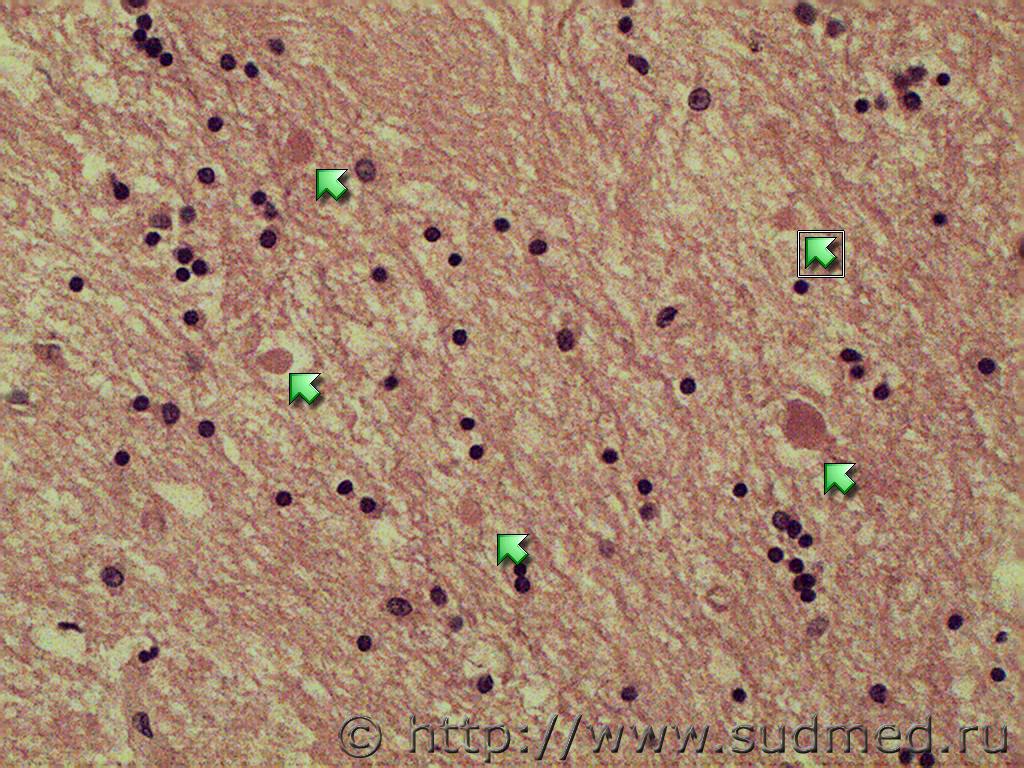 Уважаемые коллеги, пожалуйста, помогите разобраться со скандальным случаем! Из обстоятельств: выпивший мужчина въехал в металлический забор соседей, хозяин забора вытащил мужика из машины и несколько раз ударил по лицу, после чего тот потерял сознание (так в сознание больше и не пришёл). В больнице в приёмнике выставлена кома 2, через 3 дня- кома 3 и смерть. АД 215/141, пульс 160 в мин; об-но: разгибательная реакция на болевые раздражители (хуже справа), фотореакция отсутствует, корнеальные рефлексы вялые, , окулоцефалические рефлексы угнетены. Лицевая мускулатура симметричная. Мышечный тонус- без субъективной разницы сторон, снижены, сухожильные рефлексы с рук торпидные; симптом Бабинского положительный с обеих сторон. Т.к. в больнице сломан аппарат МРТ, выставлен конкурирующий диагноз:1. Ушиб ГМ мезенцефалобульбарная и диэнцефальная форма. 2.Ишемический инсульт в вертебро- базиллярном бассеине. Соп: ИБС, ГБ. В течение 3-х суток состояние ухудшалось, переведён на ИВЛ, смерть. На вскрытии пеломов костей черепа нет, в желудочках 150 мл крови со свёртками. Размягчение вещества мозга в области всех стенок боковых желудочков, мозолистого тела, стволового отдела на глубину от 0,5 до 1,5 см. в зоне размягчения в-во мозга серовато- красноватого цвета с мелкоочаговыми кровоизлияниями; в области дна 3-го желудочка под ММО распространяются кровоизлияния, располагающиеся на основании височных и лобных долей, а также кровоизлияние распространяется под ММО ствола. В веществе ствола мелкоочаговые полосчатые кровоизлияния. Выраженные признаки ГБ, атеросклероз сосудов мозга. Источник кровоизлияния в желудочки не найден. Выкладываю микрофотографии, заранее извиняюсь за качество, т.к. камера плохая. Кратко скажу, что в препаратах ствола САК; ишемия, нейроцитолиз нейронов. Ткань мозга сетчатая, выраженный периваскулярный, перицеллюлярный, периаксональный отек, отёк белого вещества. В препаратах основания правой лобной доли САК, очаговые геморрагии в подкорковых отдела; на одном из препаратов попалась вена с разрывом, стенка её с дегенеративными изменениями, неравномерно истончена со скоплением гомогенных эозинофильных масс, очаговой круглоклеточной инфильтрацией (не знаю как назвать такую патологию, на аневризму, мальформацию не похоже). В подкорковых узлах левого и правого полушарий ткань мозга сетчатая, выраженный периваскулярный, перицеллюлярный, периаксональный отек, отёк белого вещества; местами очень похоже на аксональные шары, но боюсь ошибиться с ДАП, т.к никаких нейроокрасок у нас нет. Родственники трубят тревогу, а я никак не могу закончить экспертизу, мучаюсь, боюсь пропустить травму, не дай Бог, ДАП, хотя склоняюсь к заболеванию, хотя ишемический инфаркт в данном случае тоже сомнителен. По препаратам выраженный атеросклероз сосудов, базиллярная артерия сужена на 40%. Смущает источник кровотечения в желудочки, его на вскрытии не нашли. Эскизы прикрепленных изображений |