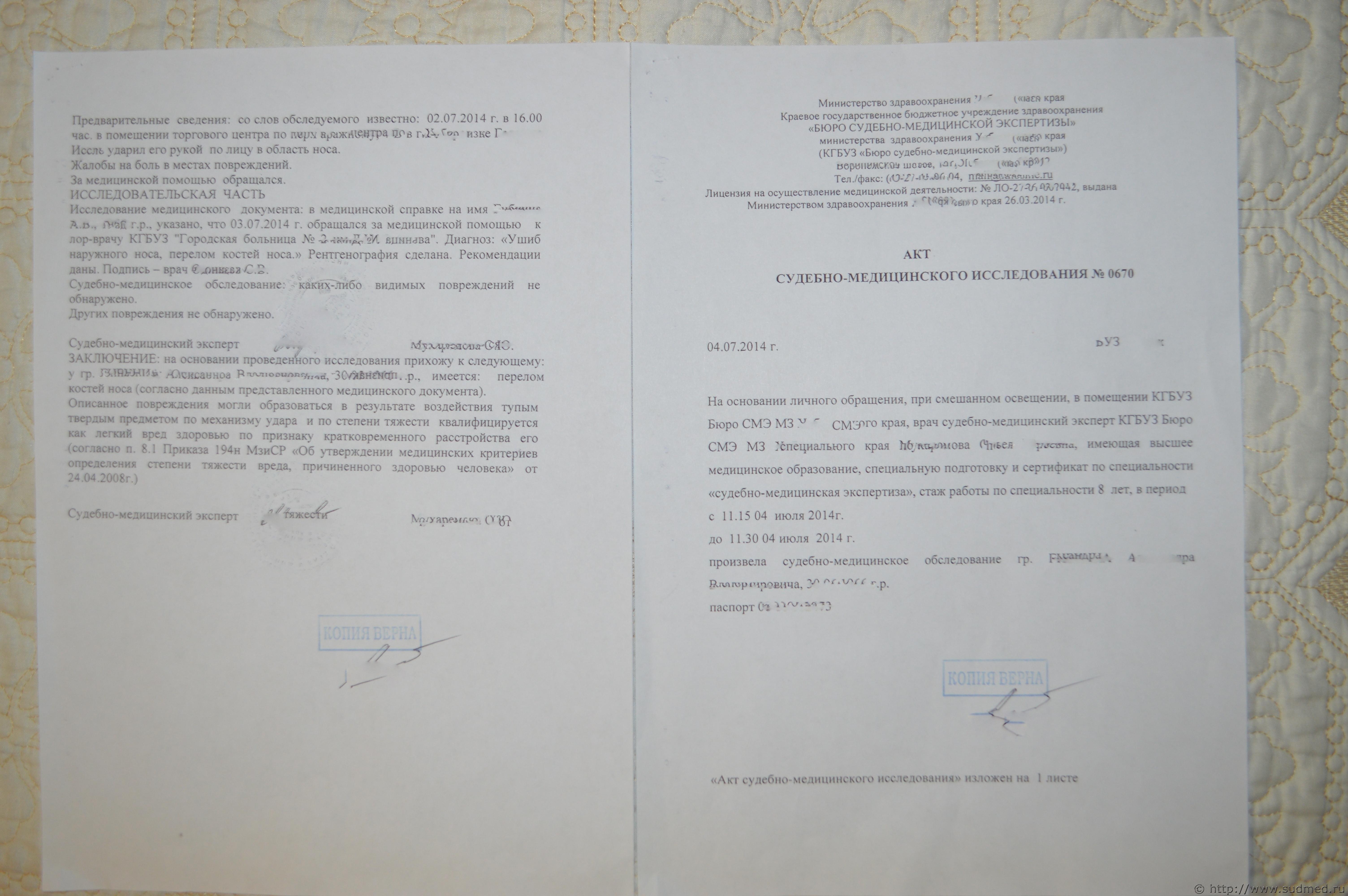 Данный акт, пытался оспорить указав руководству "Бюро судебно-медицинской экспертизы", выдавшего акт, на недопустимость определения степени тяжести вреда здоровью по справке, получил отказ,