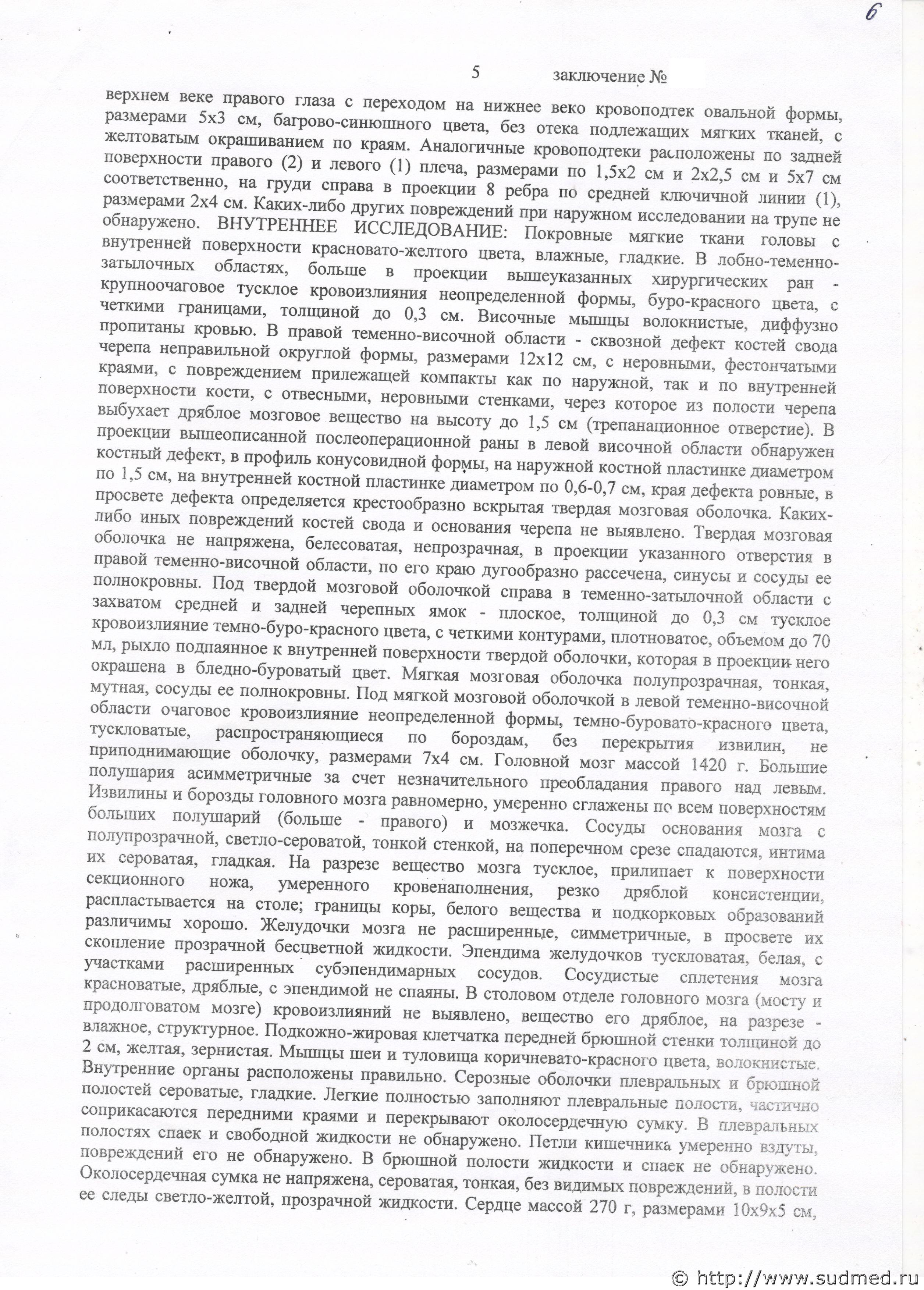 2)Почему в экспертизе СМЭ не указан перелом скуловой кости справа,ведь он указан в диагнозе в мед. документах и я так понимаю был в наличии на теле сына? 3)Должны ли были быть отражены в экспертизе СМЭ старые травмы(переломы 11 года)? 4)Фотографирование и видеосъёмка трупов по уголовным делам обязательна или нет? 5)Мог ли суд. мед. эксперт ошибиться во времени нанесения ЗЧМТ повлёкшей смерть на сутки? 6)Какие анализы берутся в реанимации? Отдельные ли они на наркотическое и алкогольное опьянение? 7)Мог ли сын после нанесения ему ЗЧМТ говорить и передвигаться(ползти) и в течении примерно какого времени наступают такие последствия когда это становится не возможным? 8)Как скоро,сколько примерно по времени, наступают последствия что указаны в мед. документах после нанесения ЗЧМТ? 9)Прерывистая ссадина 9Х2,5 см могла быть тем самым ударом от которого произошли кровоизлияния и все последствия? 10)Эта ссадина могла быть от обуха или рукояти топора? 11) Если предъявить суд. мед. эксперту топор и молоток они смогут определить орудие это нанесения травмы или нет? 12)Покажет ли эксгумация наличие пролежни спустя 8 месяцев? 13)Возможно ли после 8 месяцев с захоронения взять анализ с головы трупа на экспертизу на наличие металла или дерева? 14)Возможно ли взять частички кожи или что там ещё нападавшего из под ногтей сына если тело эксгумировать?Почва глинистая,весна,лето,осень холодные в нашем регионе были.Летом 30 градусов максимум неделю держалась,а всё остальное время +10,15 градусов. 15)Могли ли гематомы на груди справа и на задней стороне плеч быть от прижимного действия к полу рукоятью топорища? 16)Если, по вашему мнению, топор или молоток могли участвовать в действии нанесения травм, то какую затребовать экспертизу этих предметов? 17)Почему при травме не появился перелом от падения с высоты собственного роста в 15 году, если в 11 году был линейный перелом черепа , при подобной травме от падения? Не ужели так крепко сросся что при повторной травме( от которой умер)не появился снова? 18)Один зрачок больше другого. Это от удара в глаз могло произойти или от внутричерепной гематомы? 19)Могли ли травмы от противоудара быть тяжелей травмы от самого удара об пол?Зная то как он был нанесён(читая моё первое сообщение) 20)Не могу поверить,разве можно так стукнуться правой стороной головы о деревянный пол получив удар правой рукой в правый глаз вскользь, и упав с высоты собственного роста в 164 см? 21)Стоит ли оспаривать комиссионную экспертизу с такими выводами по нанесению удара или всё написано правильно? 22)Стоит ли делать экспертизу колец сына на наличие каких либо следов нападавшего?Какую? |