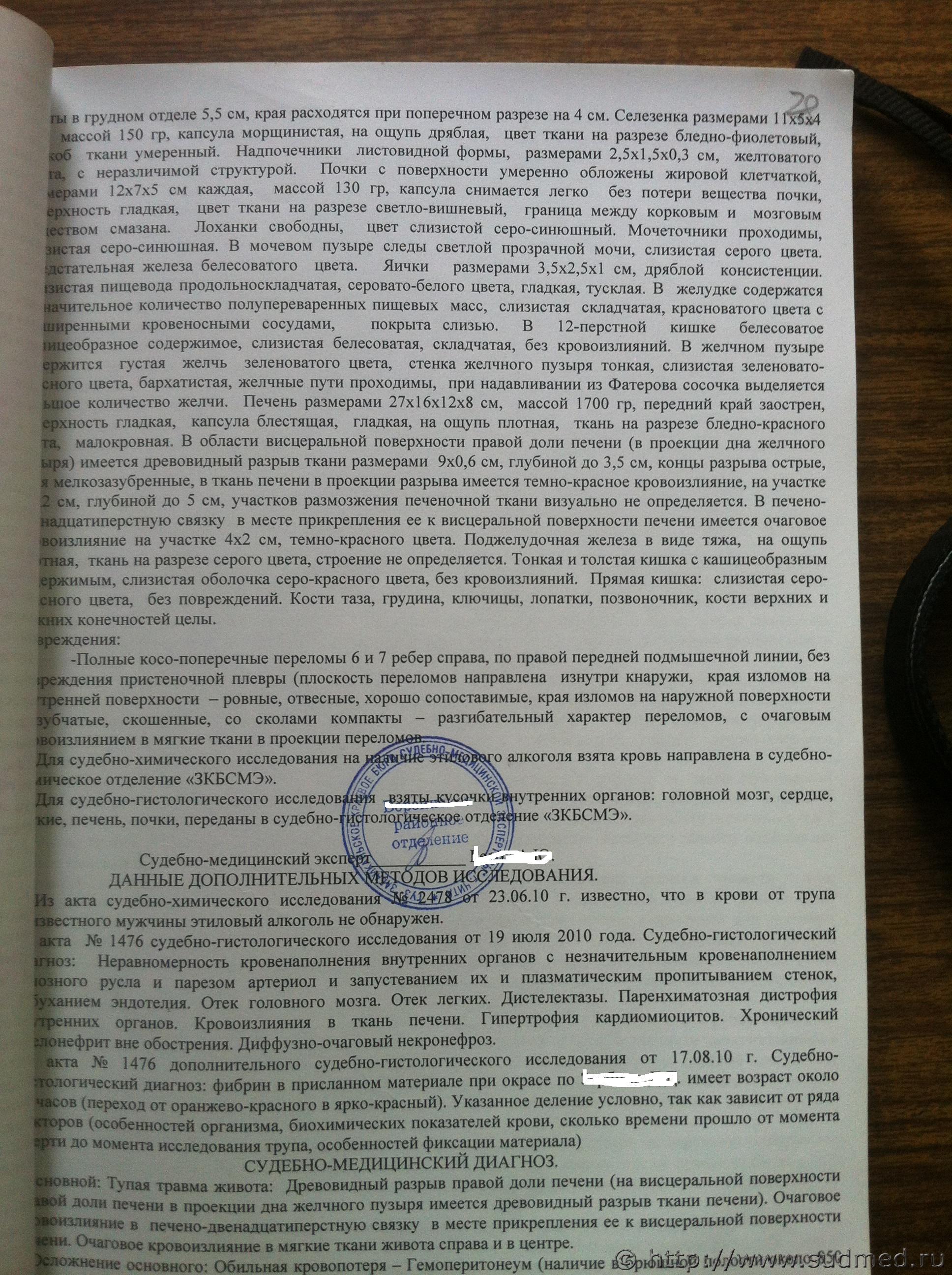Сдавление (раздавливание) печени - это сквозные разрывы, фрагментация органа. Удар спереди и снизу, там, где печень не защищена ребрами, приводит к повреждению печеночно-12-перстной связки и висцеральной поверхности печени. А при ударе сверху контакт ребер с печенью отразится на диафрагмальной поверхности, здесь этого нет.