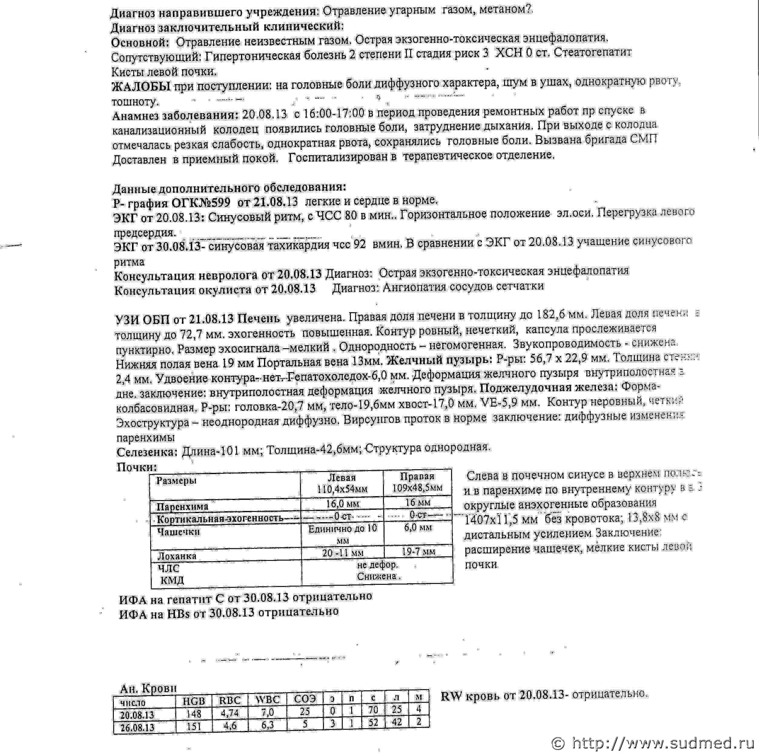 Приведенный Вами фрагмент выписки - "ни о чём". Наиболее вероятно, что вся выписка целиком - аналогично. Чаще, именно так и бывает. Поступает человек с каким-то диагнозом "... отравление...", что-то рассказывает про колодец и плохой воздух в нем, жалуется на головную боль и т.п., врачи выявляют какие-то отклонения от нормы (у человека, которому принадлежит выписка, наверняка отмечалось повышенное артериальное давление), за время пребывания в больницу что-то делают для нормализации этих отклонений и выписывают, указывая в диагнозе "...отравление...". Малоинформативно и, в основном, "со слов". Из-за малого опыта работы на этом форуме получилось отправить только часть выписки. Сейчас постараюсь отправить всю выписку. Подскажите - по этому документу можно как-то определить от чего лечили человека - от отравления "неизвестным" газом или от заболеваний, которые были у человека до происшествия в колодце? Эскизы прикрепленных изображений |