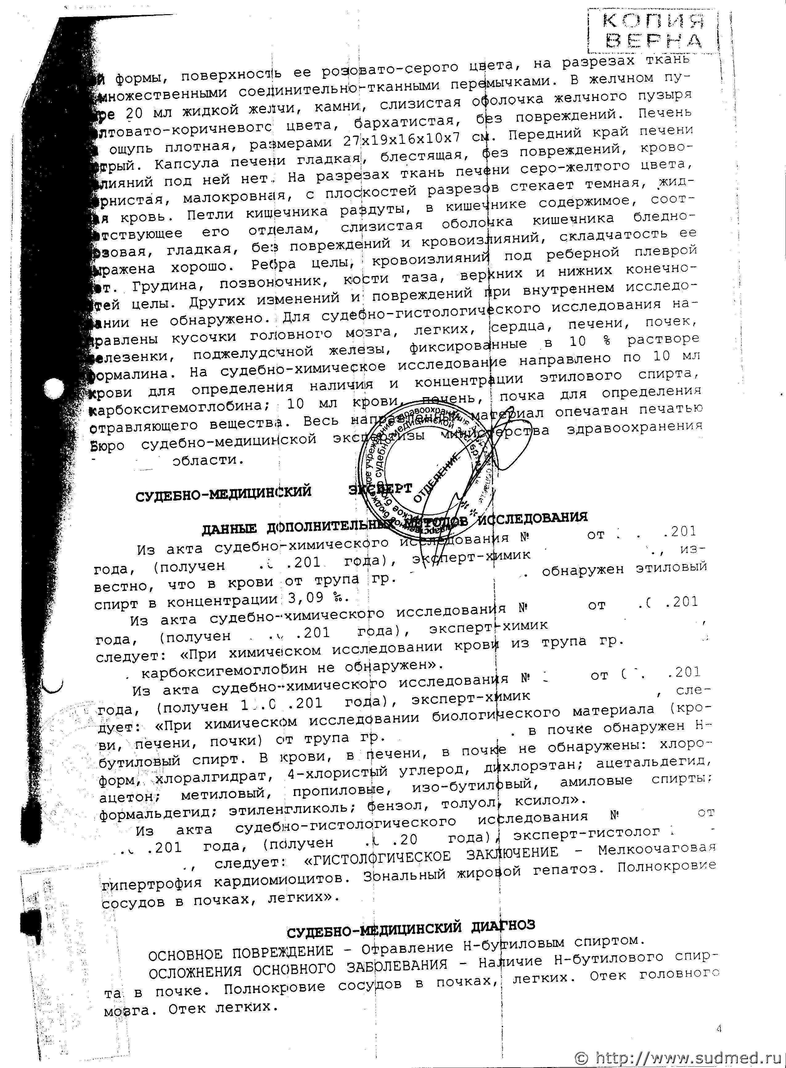 2.Н-бутиловый спирт определён качественно и только лишь в почке,а в крови и печени он не обнаружен. 3.Обосновывать причину смерти всего лишь качественным обнаружение н-бутилового спирта в почке - это надо быть слишком самоуверенным. 4.Запись в Заключении о причине смерти вызывает сомнение в правильности. |