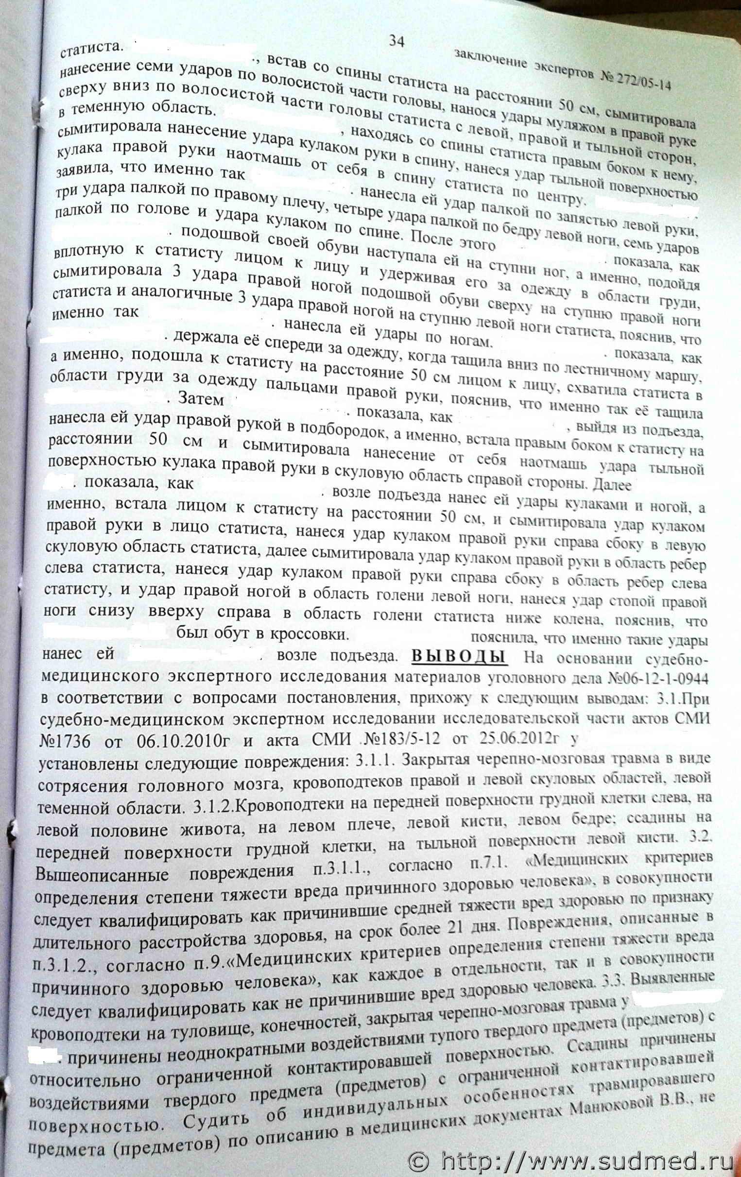 По просьбе ТС тема открыта. У меня возникает мнение, что предыдущие жалобы "потерпевшей" не полностью учитываются (ставится средний вред здоровью по длительности расстройства здоровья). - количество ударов не совпадает с количеством травм (возможно ли такое) при нанесения ударов руками и палкой. (ведь если бьют то по идее силу удара не сдерживают - соответственно должно быть большее количество повреждений) - соответствуют ли данные травмы средней тяжести - правда ли что у диабетиков необходима минимальное воздействие, что появился кровоподтек - и самое главное могла ли она сама или родственники нанести такие повреждения. - лечение в неврологическом отделении связано с ЗЧМТ или её предыдущей болезнью Показания потерпевшей постоянно меняются: сначала её били двое ладошками, в следующих показаниях её уже бьют лопаткой детской (ковшиком), в следующих уже палкой диаметром 2 см, сейчас палкой 5см - возможно ли определить чем все таки ее избивали - во всех первичных документах ничего нет о ЗЧМТ, а в больнице по прошествии 4 дней его ставят. - сознание она то теряла, то не теряла (в документах это зафиксировано с её слов и то в первоначальных этого нет). - на основании выше предоставленных документов можно ли утверждать, что ей поставили неправильный диагноз Дело в том, что ни я, ни моя супруга и соседка не наносили её ударов. И все спрашивают откуда у нее возникли повреждения. Я честно не могу ответить на данный вопрос. Подскажите как грамотно составить вопросы экспертам и кого включить в экспертную комиссию. Ниже выкладываю заключение экспертов и следственный эксперимент, Извините за такой большой объем. Эскизы прикрепленных изображений |