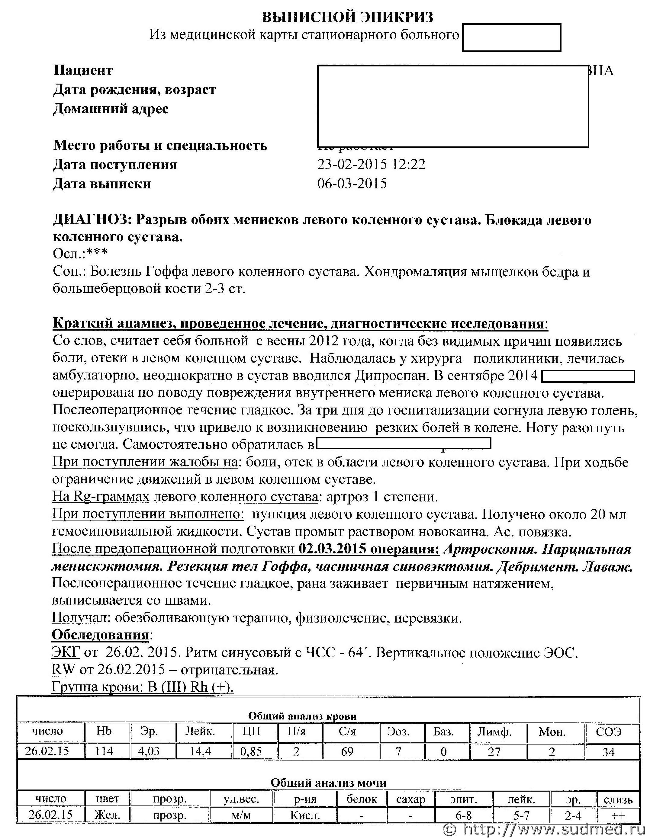 Выписки из историй - это, конечно, не истории болезни, которые изучаются экспертом для обоснованного вывода. По тому, что здесь представлено, не вижу никаких дефектов оказания артрологической помощи ни в сентябре 2014, ни позже. Был ли острый артрит или синовиит в сентябре 14? Скорее нет, чем да. Лейкоцитоз со спокойной формулой свидетельствует о хр. процессе. То же подтверждает и первая артроскопия. Так что возможное ухудшение после нее связано, видимо, не с дефектами помощи, а с обычными рисками. ___________________________________ может быть существуют медицинские стандарты или методики проведения артроскопии коленного сустава? мне на консультации 2 разный врача подтвердили факт того, что первая операция была проведена не с обычных зон доступа, т.к. послеоперационные рубцы находятся выше обычного доступа вот |