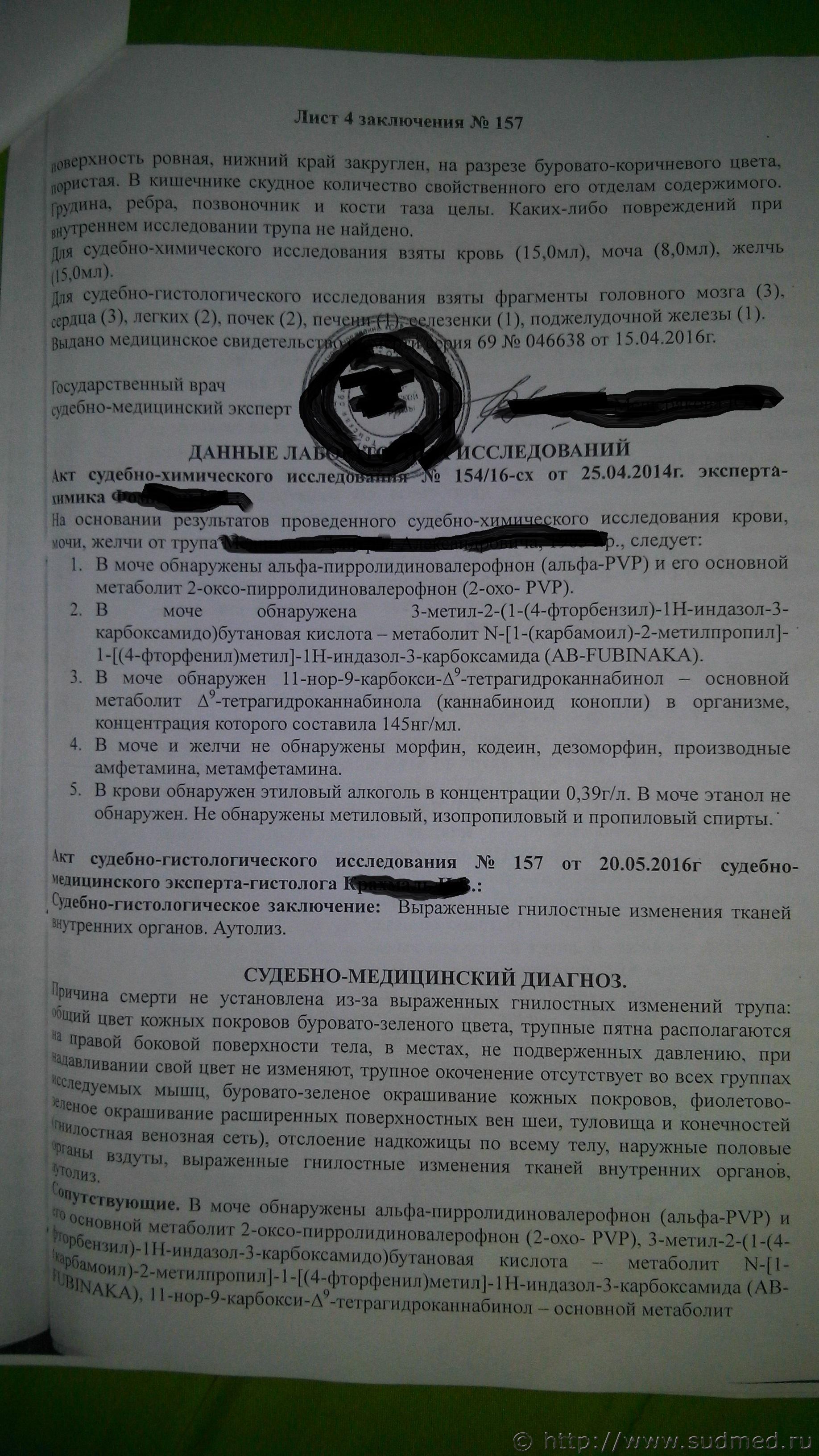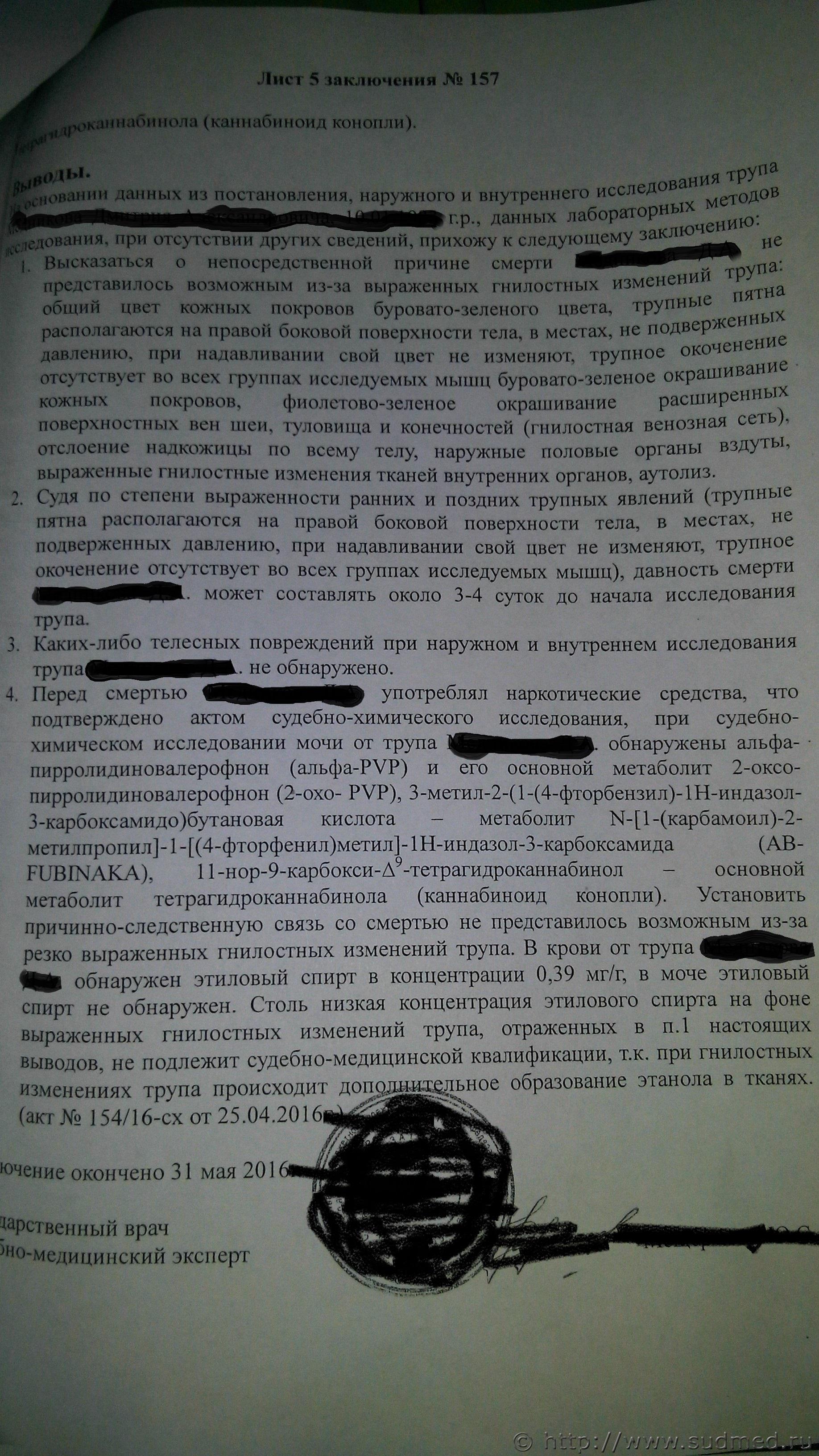 из морга в ЗАГС были переданы сведения о том, что смерть наступила 12 апреля. Заблуждаетесь.Судмедэксперт никаких сведений в ЗАГС не передаёт.Медицинское свидетельство о смерти вместе с паспортом умершего родственники сдают в ЗАГС и взамен получают гражданское свидетельство о смерти. Про давность наступления смерти читайте в Заключении эксперта.В медицинском свидетельстве о смерти вместо даты смерти может быть указана дата обнаружения трупа. В п.4 выводов эксперта указывается, что перед смертью брат употреблял наркотические средства, но причинно-следственная связь так и не была установлена. Возможно ли такое? Возможно. Может ли это быть упущением эксперта, которое повлияло на неустановление самой причины смерти? Надо читать всю экспертизу.Вы нам дали только Выводы. |