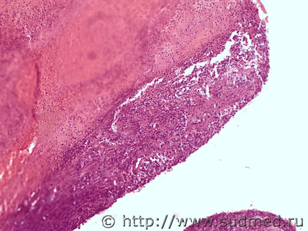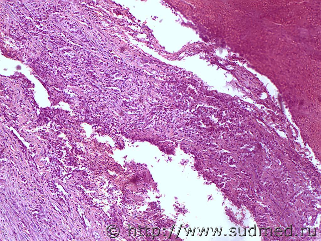 Но по микроморфологии аорты парень был не совсем здоровым т.к.продуктивный мезаортит с расслоением стенки аорты и разрывом стенки, кроме того огромная масса ни одного дня развития.