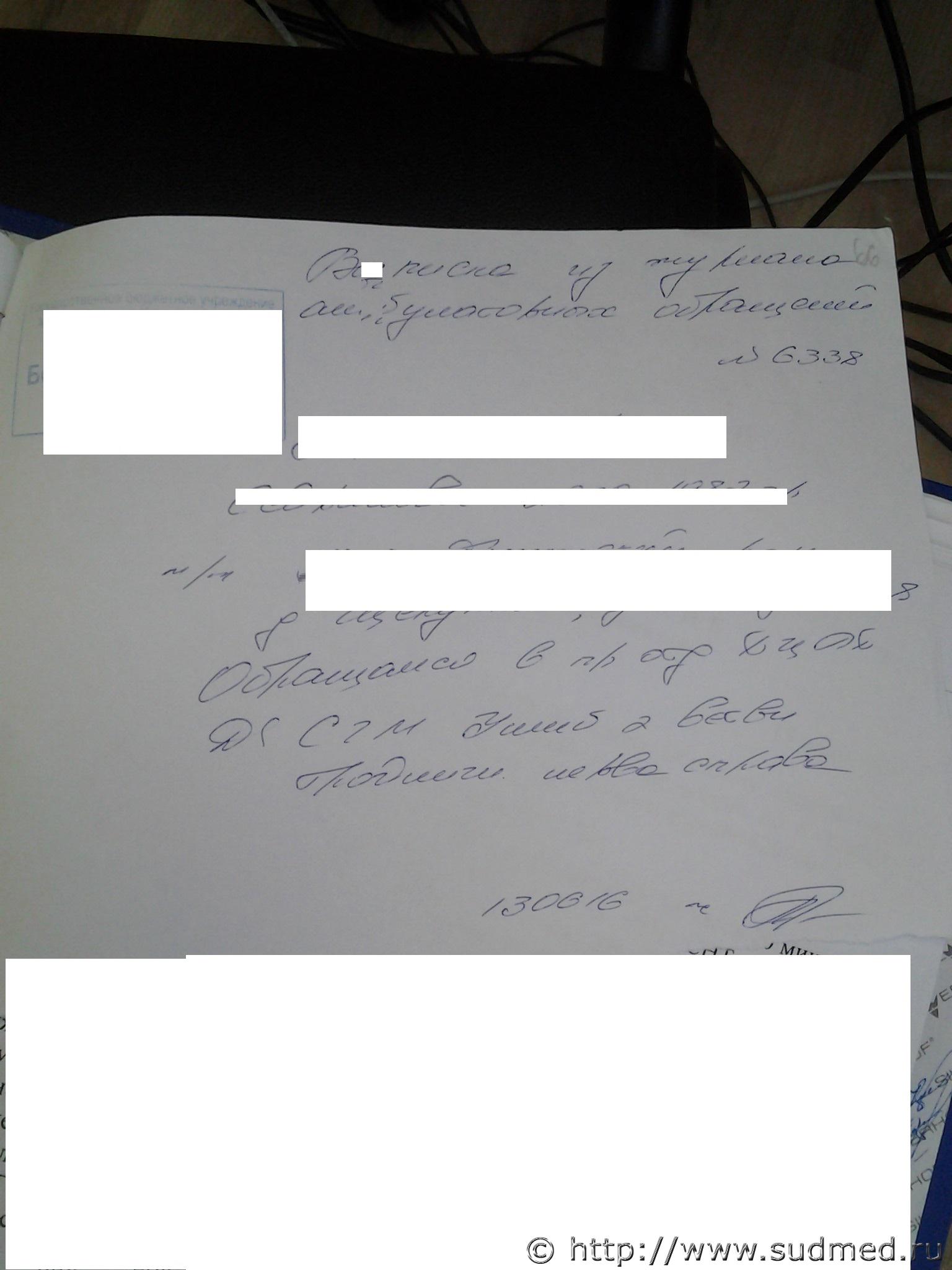 Прикрепленные Вами изображения убрал из-за их несоответствия требованиям п.7.3.1 Правил Форума судебных медиков. Внимательно посмотрите все пять фото и уберите из них личные данные, наименования организаций, в т.ч. из печатей, на листке, служащим фоном мед.справки. После этого их станет возможным опубликовать.