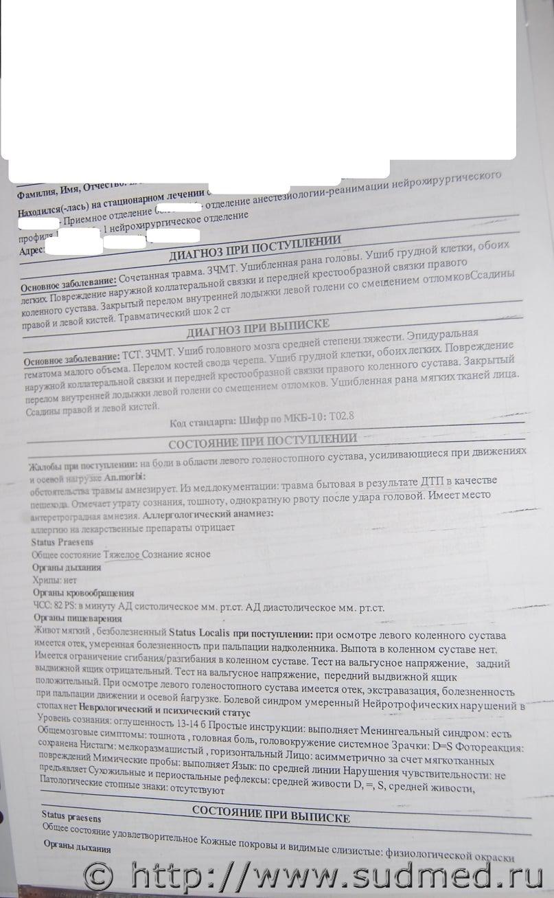 В прошлом году меня сбила машина, за рулем был полицейский. Дело очень долго пытались замять, все же удалось чуть сдвинуть дело и добиться экспертизы. Однако есть сомнения в результатах. Мои травмы: перелом костей свода черепа с переходом на основание ( 2 дня в реанимации, 2 недели в больнице, последствия лечу до сих пор) Закрытый перелом левой ноги со смещением отломков. Ушиб головного мозга средней степени тяжести. Эпидуральная гематома малого объема. Ушиб грудной клетки, обоих легких. Повреждение наружной коллатеральной связки и передней крестообразной связки правого коленного состава. Ушибленная рана мягких тканей лица. Вердикт: средняя тяжесть. Экспертизу пока посмотреть не дают, информация получена от следователя. ( и вот тут вопрос - сколько они могут тянуть и могут ли не показывать вообще? Если нужны документы ( сканы из больницы и прочее) могу выложить, но каких-то сомнений в диагнозе у врачей не было. И что делать, если экспертизу не дадут увидеть? Я бы выложила еще и результаты экспертизы для более качественного анализа, но сомневаюсь, что мне их вообще дадут увидеть. |