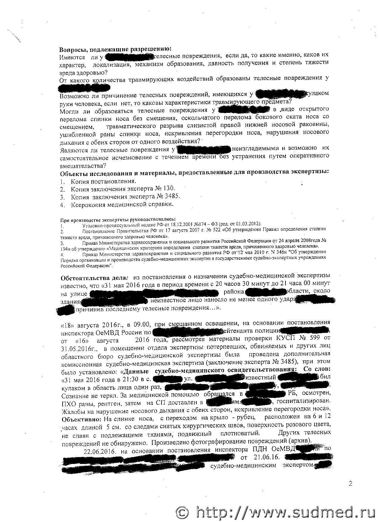 Прошу Вас помочь разобраться в данных экспертизы. 31 мая 2016 года молодой человек нанес 1 удар кулаком другому в нос (на самом деле, как говорит ударявший, он попал в челюсть и зубы потерпевшего даже содрали ему кожу на тыльной стороне кисти, остался шрам и фото, сделанное ударившим просто так сразу после потасовки), в результате чего последний получил перелом носа и был госпитализирован. при этом у него кровотечение было очень сильное в течение 45 минут. При этом нанесший удар молодой человек на 15 см. ниже потерпевшего. Как уверяет потерпевший, обвиняемый нанес ему прямой удар с расстояния вытянутой руки.. Меня тут сразу настораживает, может ли такое быть, чтобы так размозжить нос. во-вторых, участников потасовки было 3, (3 -ий сначала показания давал, что он коленом бил потерпевшего по лицу, а на последнем допросе показания изменил и его вообще вывели чудодейственным образом из дела). Но не это главное. Была назначена экспертиза, согласно которой установлено, что потерпевшему был причинен вред здоровью легкой степени. Уголовное дело не было возбуждено, т.к. подозреваемый не достиг по данной статье(115 УК РФ) возраста уголовной ответственности. Потерпевший попытались взыскать моральный вред, но не вышло. Тогда в дело вошел адвокат и через два месяца после выписки из стационара, где потерпевшему была успешно проведена операция по репозиции костей носа, потерпевший обращается в платную клинику с жалобами на затрудненное дыхание с двух сторон, одышку после физических нагрузок и ему врач ставит диагноз: ИСКРИВЛЕНИЕ НОСОВОЙ ПЕРЕГОРОДКИ, в носу растет шип. (это обращение было 08 августа 2016, а 13 августа 2016 потерпевший успешно участвует в райооных соревнованиях, посвященных дню физкультурника и даже занимает 3 место, о чем пишет местная газета). на основании справки врача от 08 августа 16 августа назначается комиссионная экспертиза, которая подтверждает диагноз и ставит вред здоровью средней тяжесьи, 13 декабря назначается еще одна экспертиза , которая проводится тем же составом экспертов и выводы те же. Прошу, посмотрите пожалуйста экспертизы. КТ не получается пока загрузить с диска. в экспертизах как-то странно указано на список исследованных объектов.  |