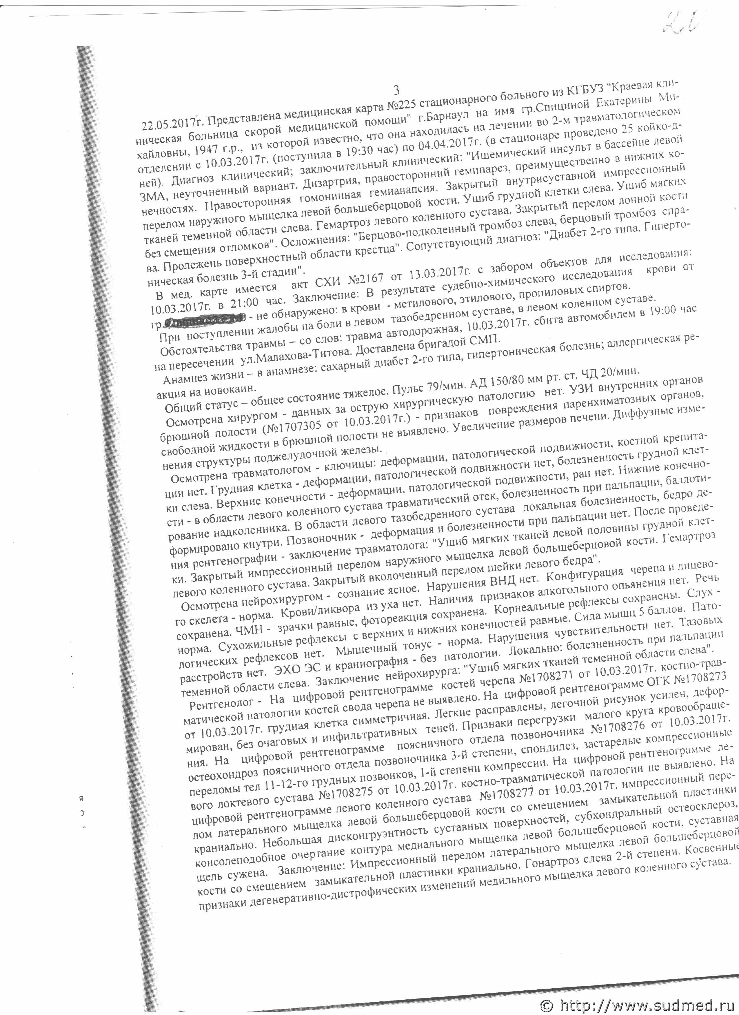 Мою маму сбила машина на пешеходном переходе на зеленый свет. В больнице СМП были поставлены диагнозы: перелом лонной кости, перелом наружного мыщелка левой голени со смещением, ушиб мягких тканей теменной области слева, ушиб грудной клетки слева. Первоначально ставился также диагноз закрытый вколоченный перелом шейки левого бедра. Во время операции на голени по установке винтов случился инсульт. Мама лежала в больнице с момента травмы до операции 13 дней. После инсульта ей сделали дуплекс вен и обнаружили берцово-подколенный тромбоз слева (в месте травмы). В проведенная СМЭ инсульт не связывают с последствиями ДТП. Эксперт также игнорирует диагнозы лечащих врачей: ушиб мягких тканей теменной области слева и ушиб грудной клетки слева, которые могли быть причиной инсульта. В выписке БСМП прямо указано на то, что инсульт-это осложнение травмы. Никогда ранее до травмы никаких проблем с тромбами или мозговым кровообращением у мамы не было. После инсульта у мамы парез всей правой части тела, выпадение поля зрения справа. Была очень активным человеком до ДТП, сейчас из дома даже не выходит, боли, слабость. Лечили инсульт еще в двух больницах. Лечимся на дому постоянно. Толка почти нет. Эксперт относит травмы лишь к средней степени тяжести. Можно ли отнести инсульт к последствиям ДТП? Возможно ли квалифицировать повреждения, как тяжкие?