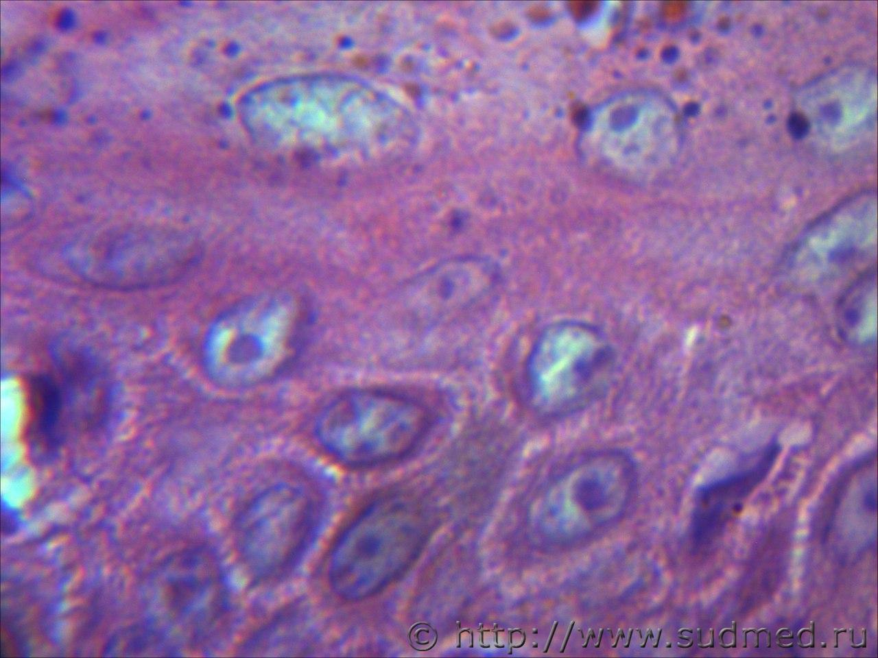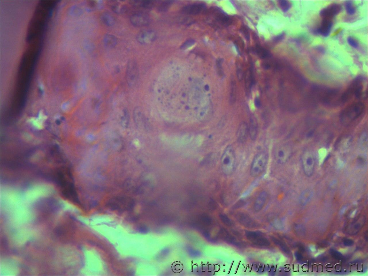 вижу что тяжи клеток эпидермиса проникающие в глубокие слои кожи и подлежащие ткани. Размеры клеток варьируют, слабовыраженное ороговение отдельных клеток, обильный воспалительный инфильтрат, пласты эпителиальных клеток в виде гнезд отделяются от эпидермиса. Склонен к ПКР