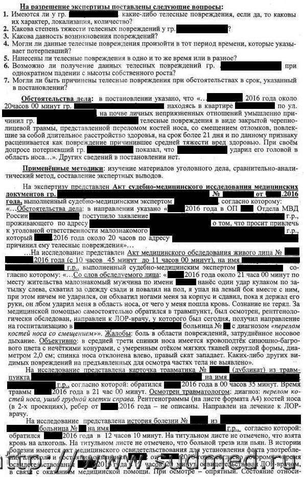 1. Предоставлении всех рентгенограмм, компьютерных томограмм костей носа за прошлые годы (если там есть перелом костей носа такой же, как наблюдается сейчас - вопрос будет закрыт в Вашу пользу). 2. О проведении следственного эксперимента. (Эксперт не может придумывать за Вас версию случайного столкновения. Если при эксперименте покажете, что ситуация достижения Вашей головой его носа выглядит достаточно реалистично, эксперт сможет рассматривать её как зафиксированный в материалах дела факт, пригодный для его экспертного анализа, а не как нечто неясное, потому - не подлежащее экспертной оценке). Принципиально, после предоставления всех мед.документов и после проведения следственного эксперимента для Вас актуальны ровно два вопроса: 1. Имеются ли у пострадавшего объективные рентгенологические признаки перелома костей носа именно от ... (дата предъявляемой травмы) или этот перелом мог быть получен при бывших в прошлом травмах носа? 2. Могла ли травма носа у ... образоваться при обстоятельствах, продемонстрированных в ходе следственного эксперимента от ... (числа)? Остальные "стандартные" вопросы поставит следователь (обнаружены ли повреждения, какие именно, их степень тяжести, механизм, давность образования). |