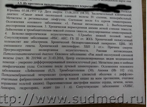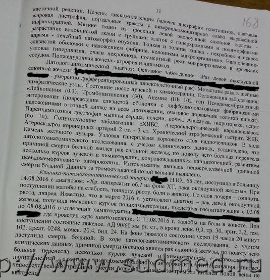 В настоящее время проходит доследственная проверка по факту ненадлежащего оказания медицинской помощи ( по результатам комплексных экспертиз(основная и дополнительная))качество признано группой экспертов ненадлежащим. Вопрос мой чисто обывательский, я инициатор проведения проверки и всех мероприятий, но он очень важный для меня. Дано: женщина -65 лет, с 2015 года ( октябрь) вертифицирован диагноз -плоскоклеточный рак левой околоушной слюнной железы, Т4NxM0, неоперабельна в момент установки диагноза, рекомендована ХЛТ .Ноябрь-декабрь 2015 лучевая терапия 66Гр, апрель 2016 год- рецедив с метастазами в шейные лимфоузлы, май- 8 августа 2015 год проведение химиотерапии ( 4 цикла), через 21 день, схема PF+цетуксимаб. Выписка из стационара 9 августа, 12 августа усиление токсических реакций после ХТ ( диарея, рвота, слабость), 14 августа доставлена в больницу, 15 августа -смерть. Врачи больницы изначально предлагали отказаться от вскрытия, однако я не могла понять причину смерти -непосредственную, а не установленный при жизни диагноз( понятно, от чего бы не умер пациент, основная причина- основной диагноз онко), поэтому настояла. Естественно, во время лечения были ежеквартальные исследования МРТ мягких тканей, узи брюшной полости, рентген грудной клетки, анализы крови, мочи, онкомаркера. Динамика четко отслеживалась, при поступлении в больницу были сделаны узи брюшной полости, КТ брюшной полости и грудной клетки. Меня интересуют в акте вскрытия описание- прикорневых и паратрахеальных лимфоузлов, точнее их цвет. Увы на гистологию их не отправляли, в патологоанатомическом диагнозе ( заключении) никак не отражены. Что это или без гистологии однозначно утверждать природу теперь невозможно? Скажите, исходя из акта вскрытия ( могу, если нужно и другие материалы ( исследования) прикрепить) интоксикация-это следствие псевдомембранозного энтерита(последствие химиотерапии) или это раковая интоксикация ( генерализация злокачественного процесса терминальной стадии). Буду благодарна за ответы. Эскизы прикрепленных изображений |