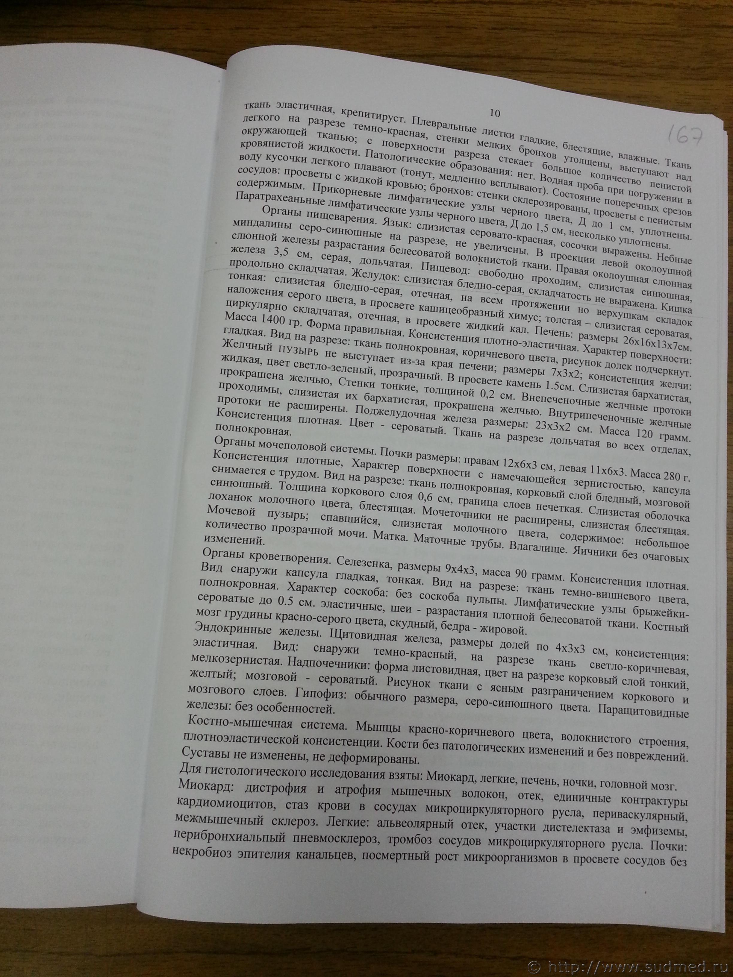 Что явилось основной и непосредственной причиной смерти - не знаю. Удивляет "посмертный рост микроорганизмов" в просвете сосудов почек и надпочечников.Откуда известно,что этот рост "посмертный" ? В целом протокол оформлен на низком уровне (включая и гистологическое описание) и,наверное,разобраться с причиной смерти не получится. Принадлежат ли данному трупу куски кишечника,слюнной,поджелудочной желез и надпочечника ? Кто его знает ? |