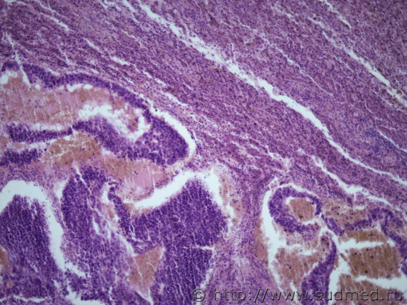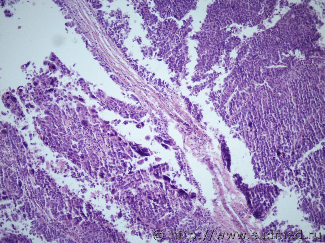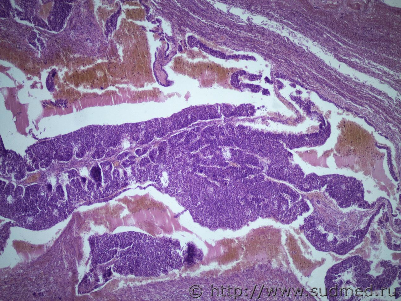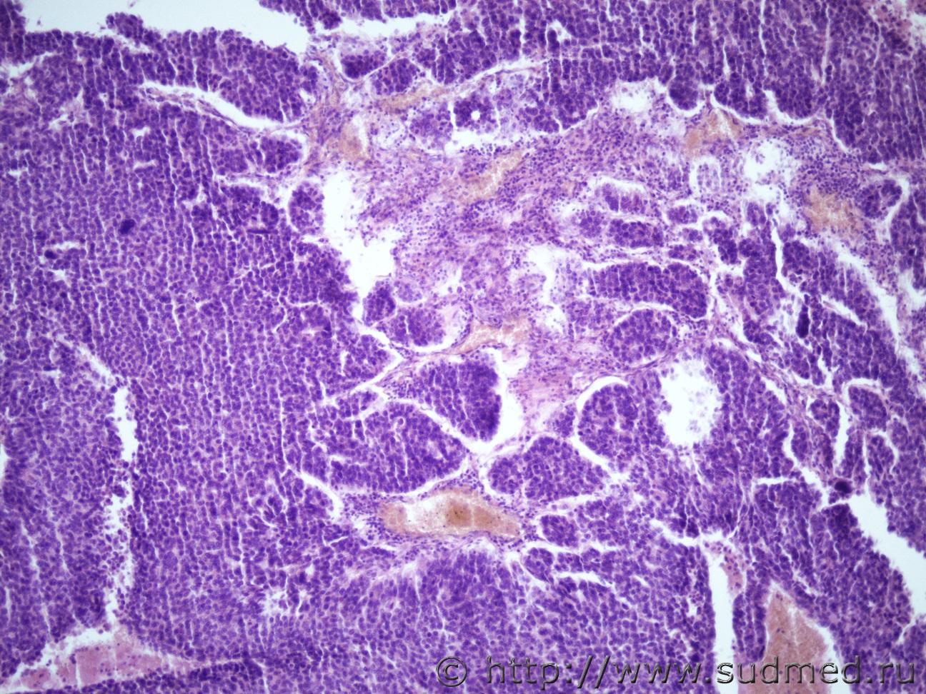 Ув. коллеги. Как и всегда необходима ваша профессиональная помощь. Жен 67 лет. На вскрытии - структура поджелудочной железы нарушена, гнойное распловление тела и хвоста пж, в области головки пж определяется плотноватый узел диаметром 5.5 см, богато васкуляризированный, на разрезе молочно-белого цвета с желтоватым оттенком, по консистенции близок к творожной массе. В области правой доли печени аналогичный узел. Метастатическая карциноидная ( нейроэндокринная)опухоль ( круглоклеточная монморфность с гиперхромными ядрами и некроз) |