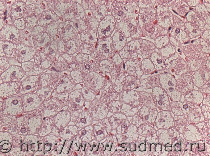 Относительно второй микрофотографии я согласна с мнением коллег. Что касается первой микрофотографии, то американскими коллегами утверждается, что это жировая мелковезикулярная дистрофия. Ошибочное мнение коллег? Микровезикулярное-это, я думаю, некорректность перевода с английского, для нашего языка- это мелкокапельная липидная дистрофия. На фото гидропическая дистрофия. В качестве эксперимента покрасьте на жир, если есть время и интерес. Вопрос отпадёт. |