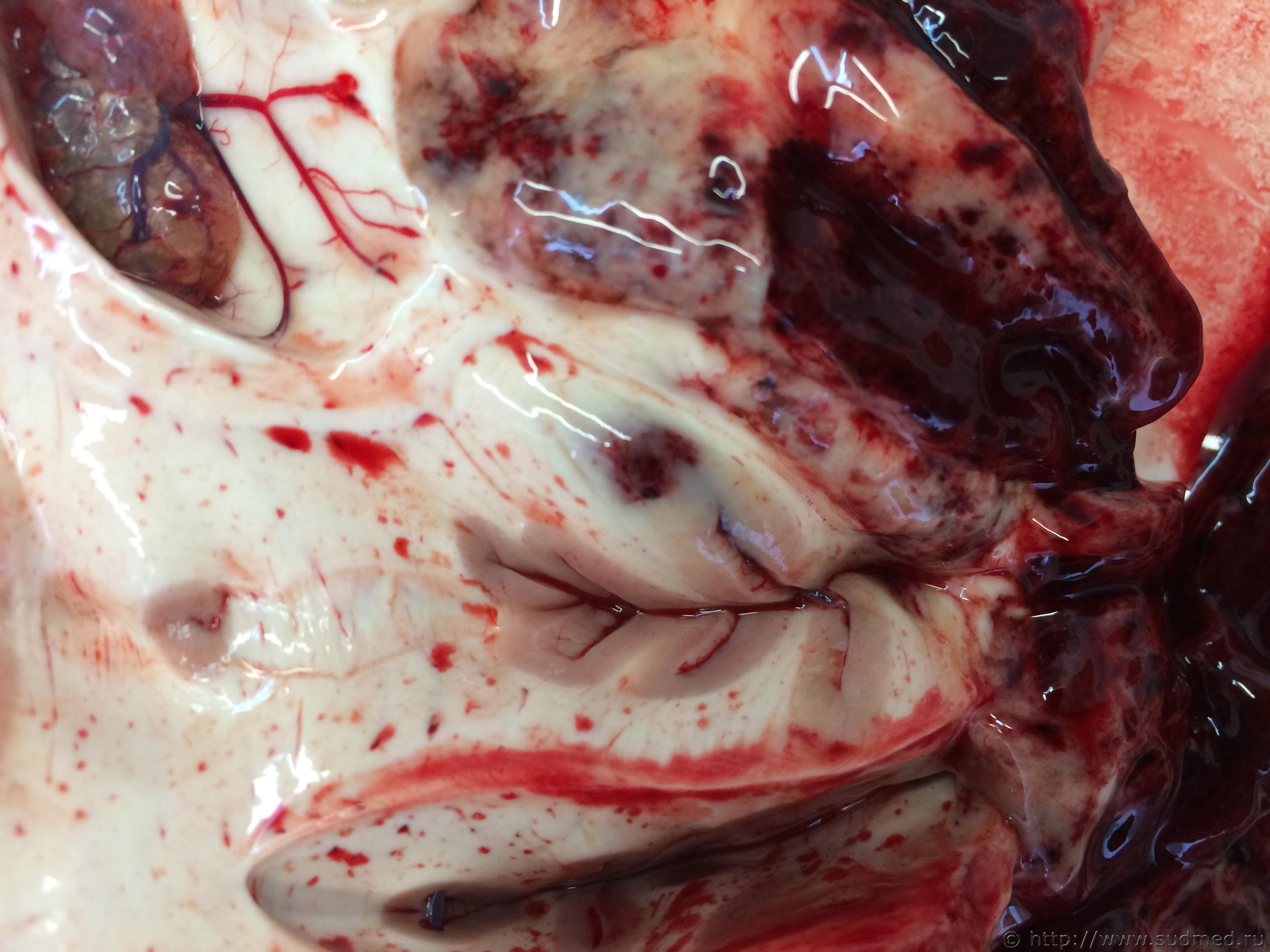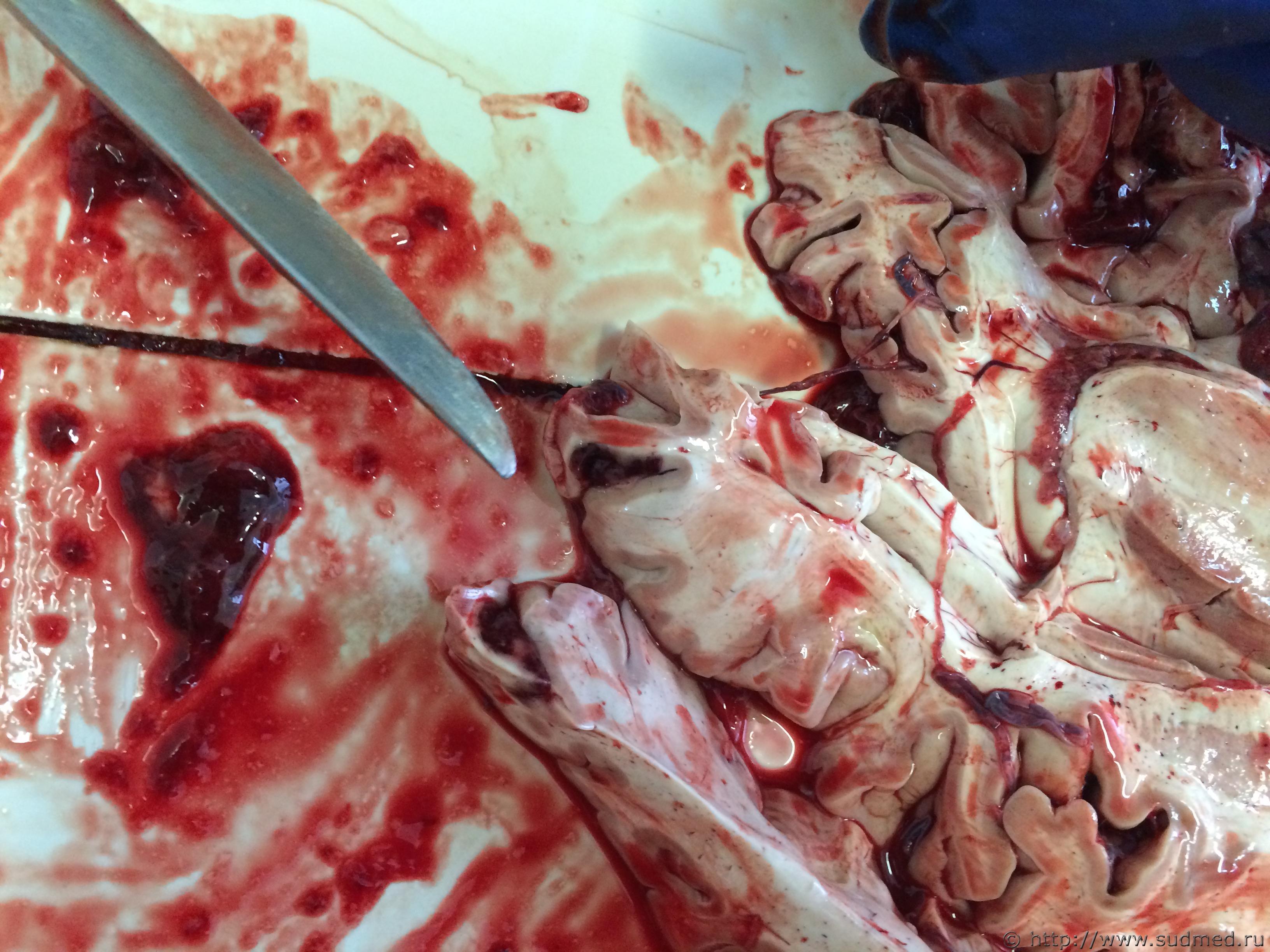 1. В левой височно-теменной области на коже кровоподтек 2. Левая затылочная доля 3. Правая затылочная доля 4. Правая затылочная доля, левая аналогичная |