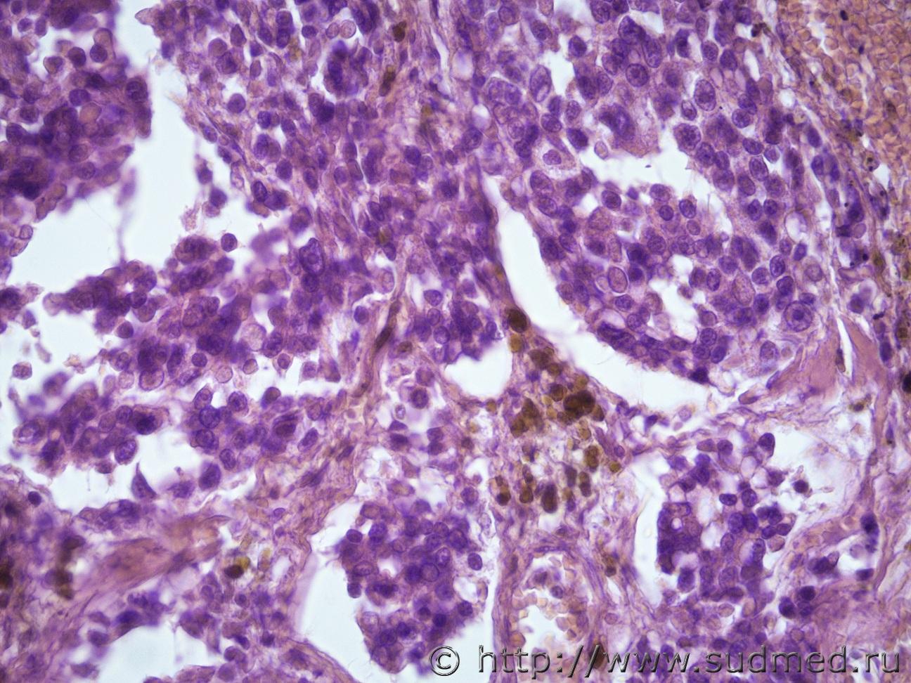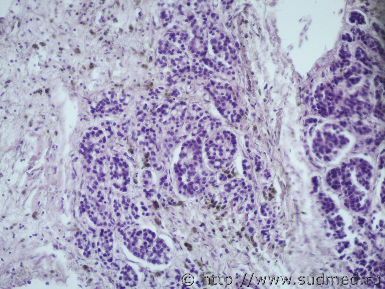 В данном случае можно поставить аденокарциному. Если на первых фото ткань простаты, то можно сказать, что опухоль с высоким индексом Глисона, видны солидные пласты опухолевых клеток, хотя кое-где все же прослеживаются железистые структуры. Более прицельные снимки бы глянуть, на большем увеличении.