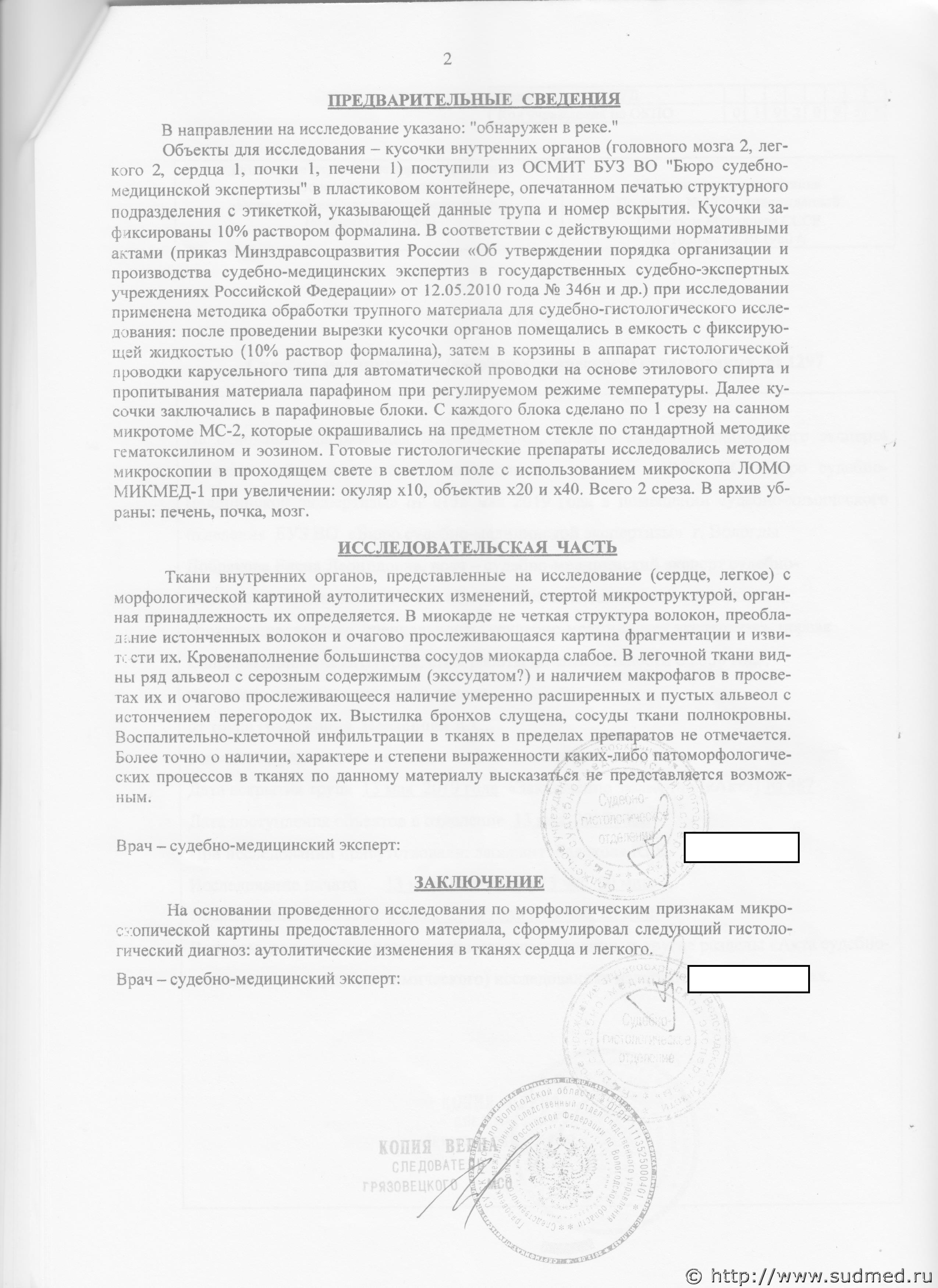 Здравствуйте, прошу помочь разобраться в результатах вскрытия и проведенной гистологии. Человек пропал 27 апреля, по версии следствия утонул. Тело нашли в реке, спустя 2 недели 12 мая. Тело всплыло. Из района в город для вскрытия транспортировка заняла время. Вскрытие проводили на следующий день 13 мая. Вскрытие, как сказали ничего не показало, органы отдали на гистологию. Гистология так же не помогла определить причины смерти. Меня интересуют следующие вопросы: