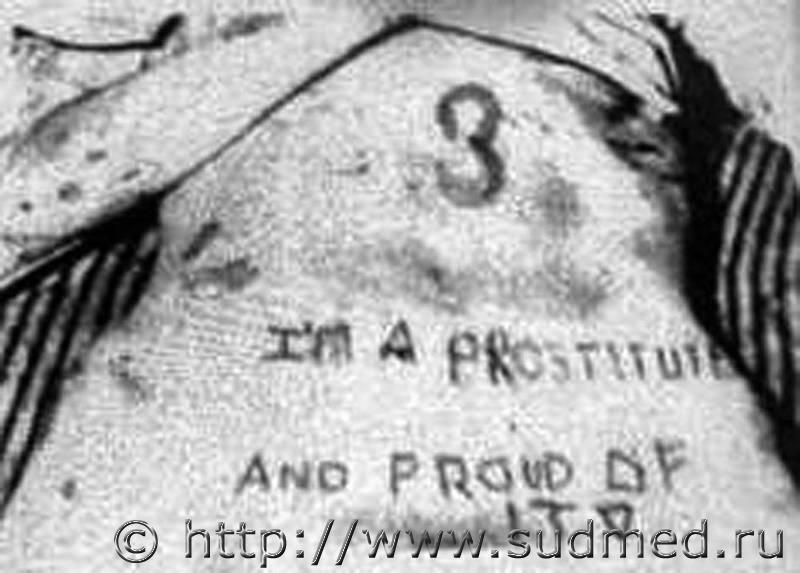 Ниже привожу фото тела американской девушки убитой в 1965ом году после длительных пыток(имя не привожу по правилам форума). Дело было довольно резонансным в США, по этому делу написано несколько книг и снято два фильма(в том числе «Американское преступление»). Среди прочих ранений, на животе была сделана надпись: I’m a prostitute and proud of it. По показаниям обвиняемых надпись сделана швейной иглой. Патологоанатом, производивший вскрытие, сделал такое (немного странное на мой взгляд) заключение: «надпись сделана острым либо нагретым предметом, либо острым и нагретым предметом». Ну и собственно мой первый вопрос: возможно ли сделать такую надпись швейной иглой на живом теле? Как вы считаете? Вторя серьезная травма, это цифра три выше первой надписи. Согласно и показаниям обвиняемых, и заключению патологоанатома это ожог, сделанный кочергой либо чем-то еще(в деле присутствует несколько предметов-кандидатов на ожог, в том числе металлический крючок и болт). Ну и мой вопрос опять таки: возможно ли нанести такой ожог на живое тело и ожог ли это вообще? Спасибо! Приношу извинения за качество снимка, он из тех далеких времен... Эскизы прикрепленных изображений |
