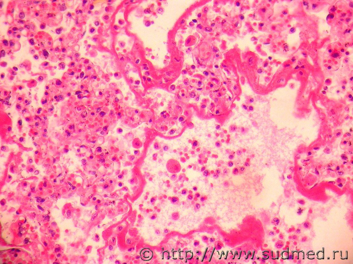 По-моему, различий в гистопатологической картине трахеобронхита или интерстициальной пневмонии при всех трех видах вируса не будет. Итальянские коллеги разрешили мне поделиться свежей картинкой с их микроскопа - гиалиноподобные мембраны в легких при ARDS. Больной (76-летний мужчина) находился 3 дня на УВЛ. Вскрытие было где-то неделю назад. Спасибо, Dr_Bob. Я такого же мнения. Не сочтите за глупость, разве гиалиновые мембраны - не респираторный дистресс-синдром? И еще есть инфа, что разрыв альвеол происходит. На ум приходит только как следствие эмфиземы (компенсаторная одышка из-за неусваимости кислорода)? Коллеги, Ваше мнение? Ибо некоторые товарисчи (не медики) с пеной у рта мне доказывают, что это вирус их рвет! Я тихо хихикаю каанешна..... |