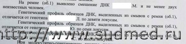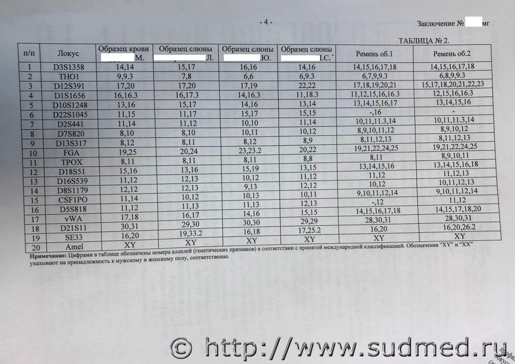 Помогите пожалуйста понять, мог ли ошибиться эксперт? Считая комбинации в таблице, прихожу к выводу, что эксперт не верно сосчитал количество следов ДНК, выделенных с образцов ремня, и отличающихся от генотипов подозреваемых в убийстве лиц: Л., Ю., С. Как правильно сосчитать количество совпадающих комбинаций ДНК? Исследуется ремень, который сняли с шеи жертвы. Повешение инсценировано. На образцах ремня обнаружено смешение ДНК жертвы М и ДНК не менее 2 человек . В прикрепленной таблице в третьем столбике - образец крови жертвы М, четвертый столбик - образец слюны подозреваемого в убийстве Л, пятый столбик - образец слюны подозреваемого в убийстве Ю, шестой столбик - образец слюны подозреваемого в убийстве С. И еще нужна такая помощь. Как грамотно сформулировать вопрос эксперту для расчета вероятности (в процентах) обнаружения следов ДНК подозреваемых в убийстве лиц. Буду ходатайствовать о назначении дополнительной м/г экспертизы |