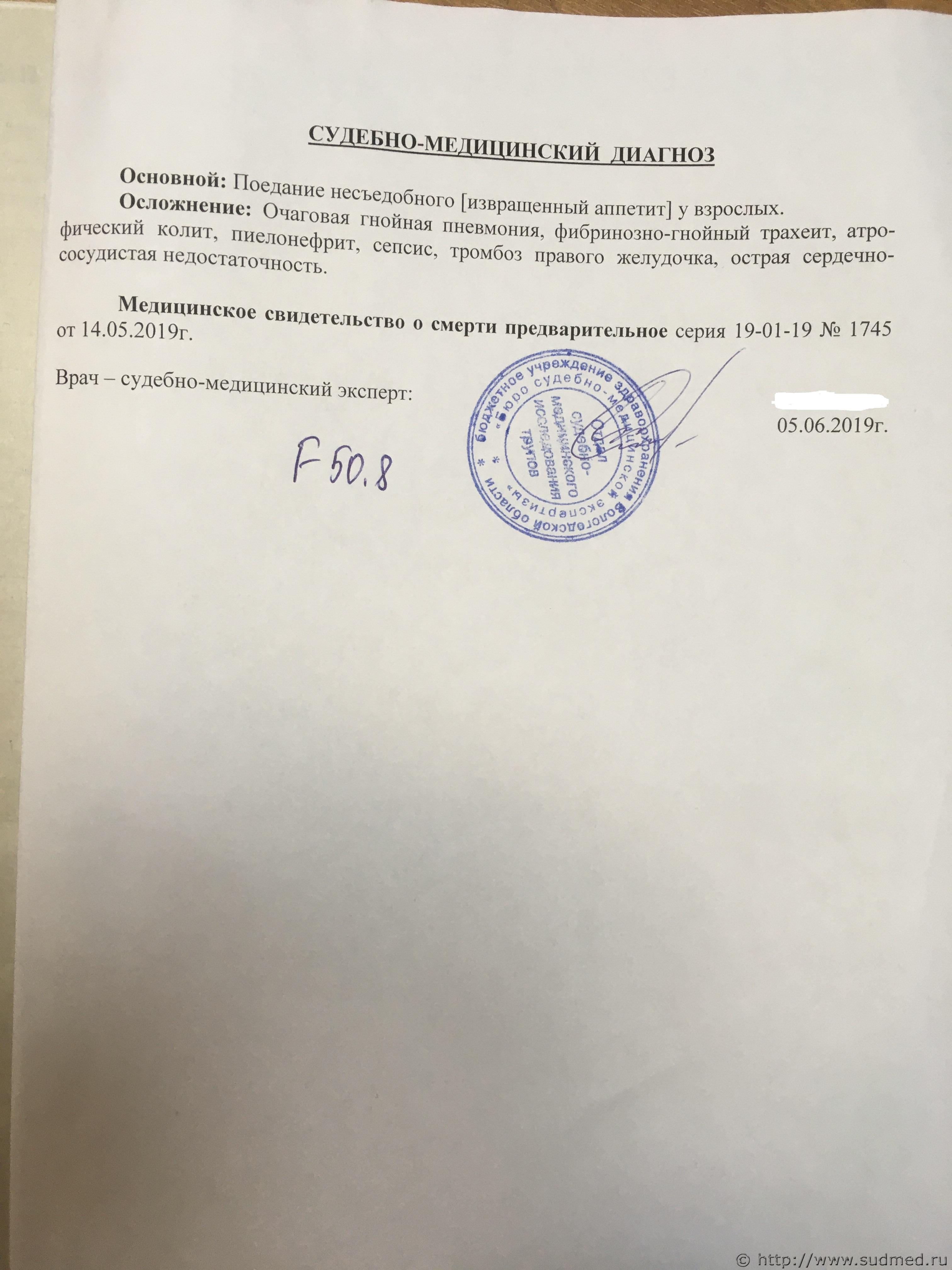 судебно-медицинский диагноз меня позабавил, такого я еще не встречал. Рубрику "Осложнения" комментировать не буду, а вот про F50.8 напишу, что ничего "забавного" в этом нет. Такой д-з допустим, например, гр-н съел упаковку зубочисток с последующим повреждением тонкой кишки и развитием перитонита. F50.8 встречал у психически больных. Сам по себе морфологический диагноз (будь то патолого-анатомический или судебно-медицинский) должен содержать  морфологический компонент  Верно, вот этого и не хватает.  |