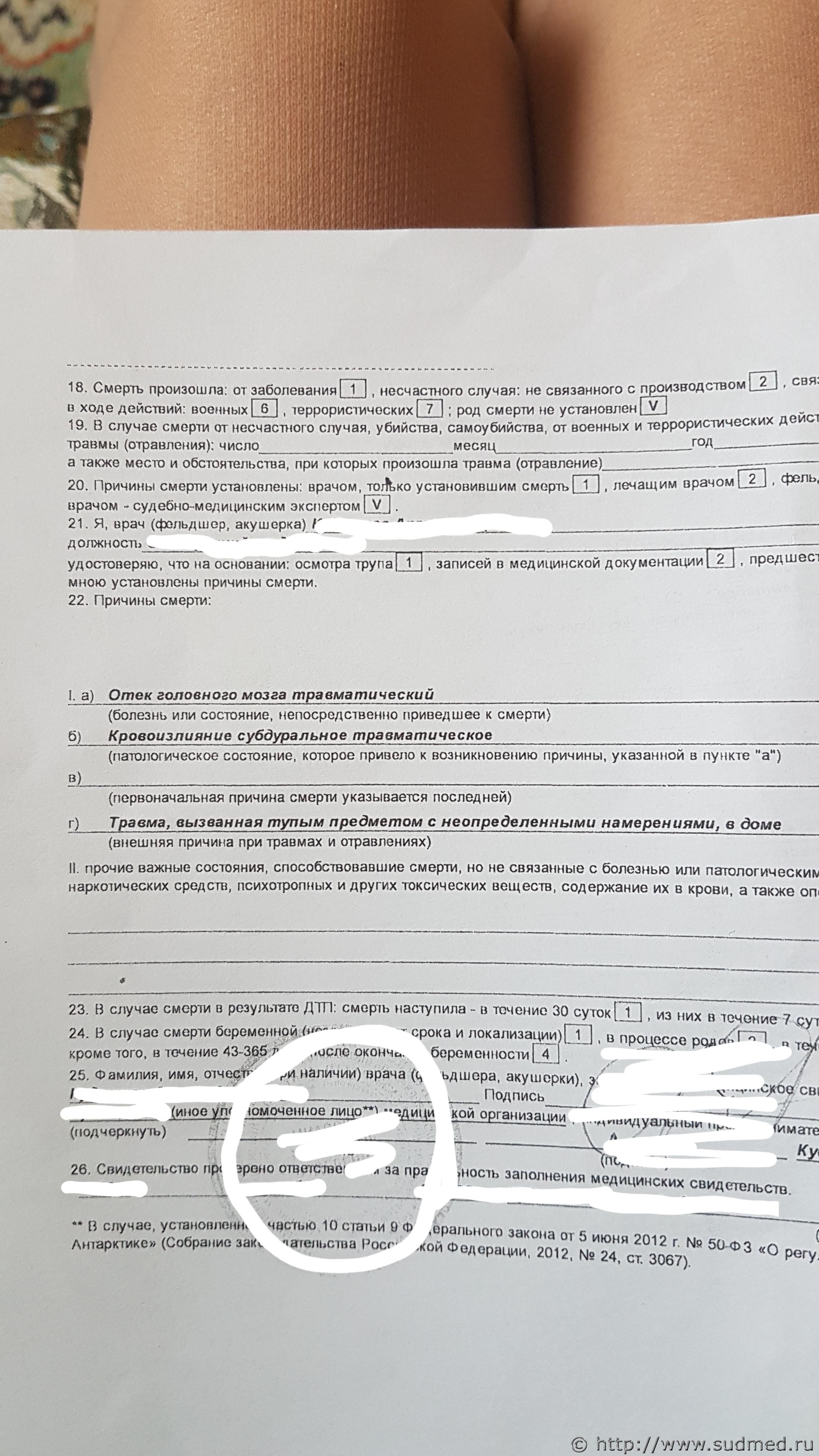 Мед.заключение о смерти 1. А Отек головного мозга травматический Б. Кровоизлияние субдуральное травматическое В. Г. Травма, вызванная тупым предметом с неопределенными намерениями, в доме. Мед.экспертизу нам сказали получим только после 1,5 месяцев. 1. Повторяю ещё раз - это данные из медицинского свидетельства о смерти. 2.Пока тему закрою, так как консультировать нечего. Когда будет готова экспертиза, обратитесь к любому модератору с просьбой открыть эту тему. |