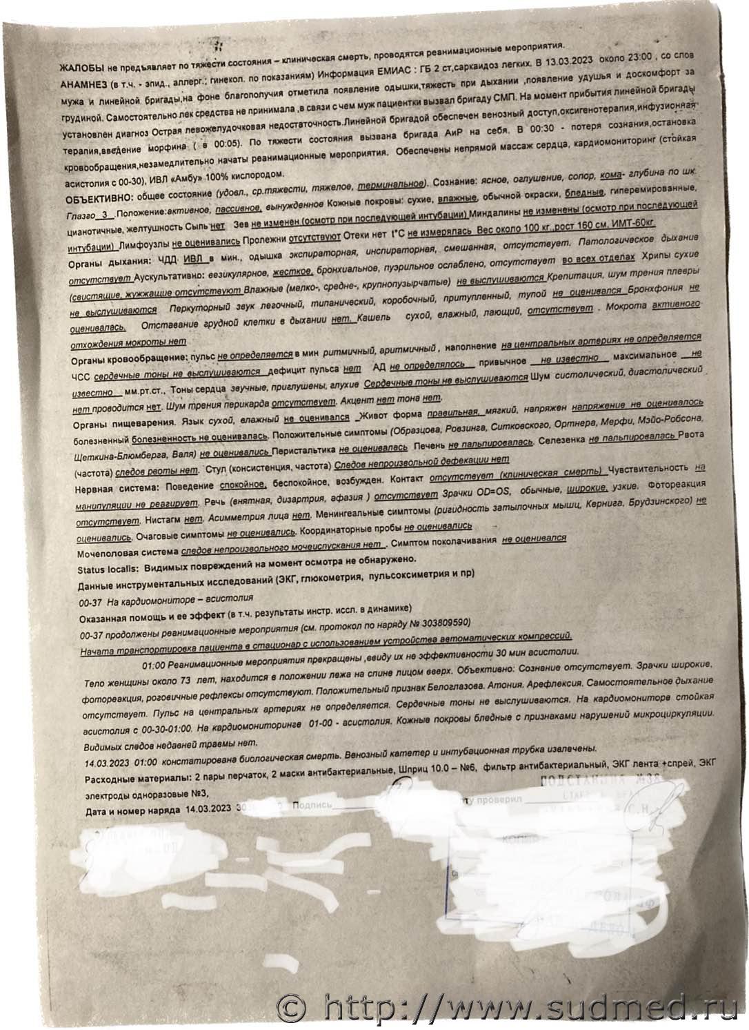 Я постараюсь сделать фото всей судмедэкспертизы. Мне прислал в ватсапп три фото участковый через знакомого. Причем мне сказали если я хочу увидеть его весь, мне нужно дождаться уведомления и затем писать заявление с просьбой ознакомить меня с его содержанием. Буду пытаться начать процесс на следующей неделе. Джэк ЭКГ, причем передавалось по ЭКП (это какая то электронная система скорой) для оценки этой ЭКГ другим человеком Вот документ, вроде все честно, кроме маминого веса, никак там не 100, 80 кг это максимум. ![]() ![]() Эскизы прикрепленных изображений |