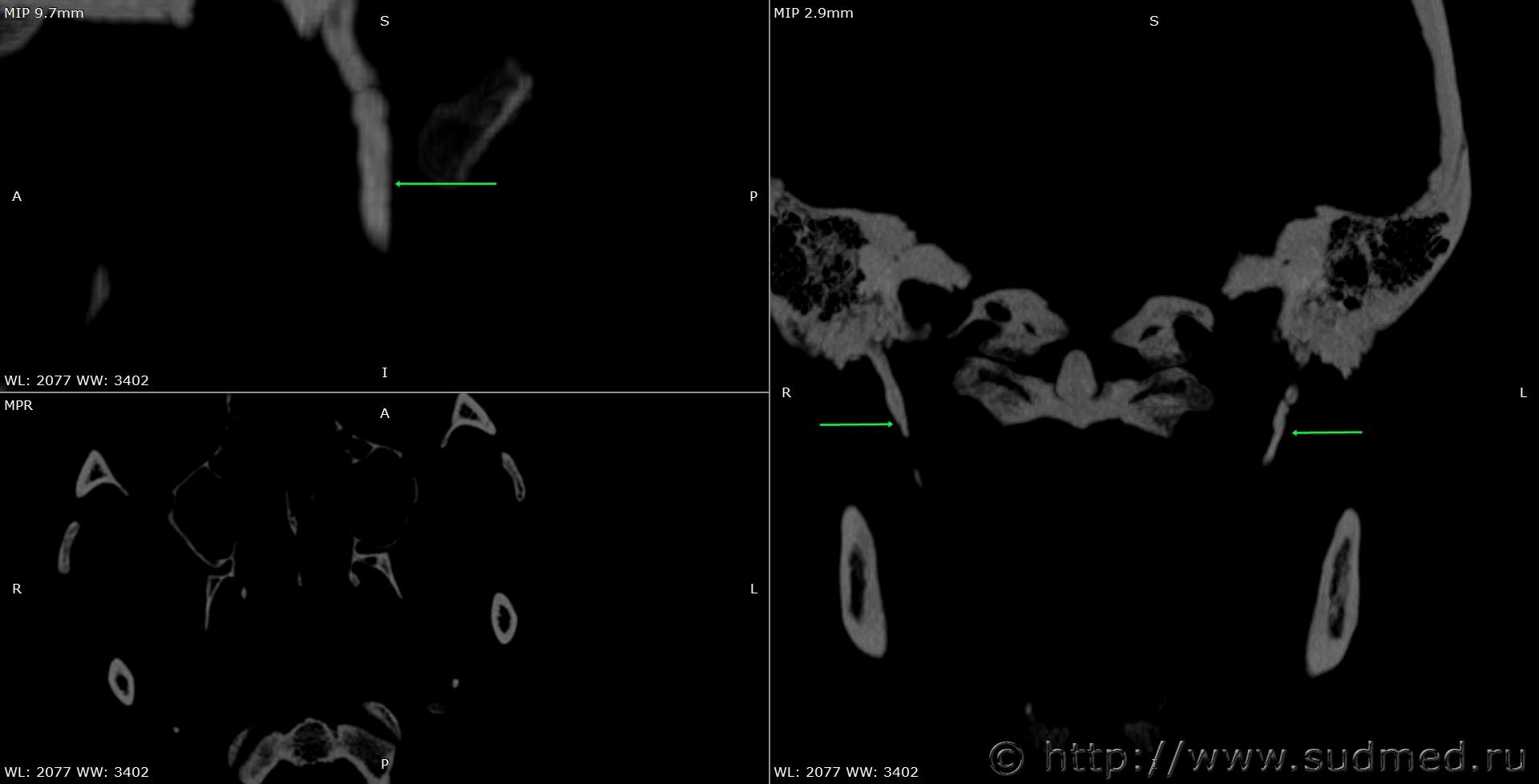 По поводу шиловидного отростка. Во-первых - просветление может быть и участком незарощения костной ткани между двумя участками окостенения и быть аномалией развития, а значит и "отклонение" может являться результатом имеющейся динамической подвижности, второе - какие признаки заращения? Разрешение не может быть меньше 0,5мм, но как правило, часто выставляют и 0,8 и 1,0мм, что не дает возможности оценить морфологию краев предполагаемого травматического повреждения костной ткани. Без наличия кровоизлияния в окружающих тканях (а это при использовании определенных программ для чтения томограмм, исследовать можно) судить нельзя. Мне регулярно попадаются заключения обычных рентгенологов, в которых они судят исходя из принципа "лучше перебдеть, чем не добздеть", а мне потом опровергать приходиться.