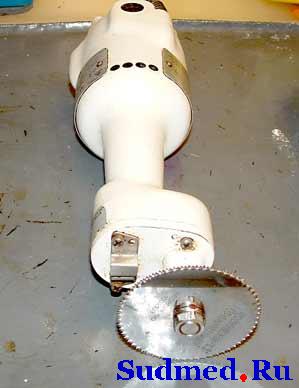 Ув. эксперты, я в своей практике, устал уже вскрывать череп ножовкой. Пробовал електродрелью, с насадкой фрезы по металлу. Ножовкой, долго и нудно, тупиться быстро, дрелью с фрезой опасно, часто зажимает фрезу, и чуть не вырывает с рук дрель, а рядом руки санитарки, которая держит, голову. В общем, с точки зрения безопасности от дрели отказался, хотя ней быстрей, но и брызги от фрезы летят в разные стороны. Так вот, я хотел спросить, а как у Вас. Есть ли у кого специальнаый инструмент, для вскрытия черепа. Я когдато на кафедре видел, немецкую машинку, в виде дрели, с фрезой (похожа), только фреза не крутится, а совершает, маятникообразные движения с огромной частотой и маленькой амплитудой, и безопасно и просто. Ее только приставляешь к черепу, она сама погружается в кости. Мечта эксперта- такая машинка. Можек кто нибудь чего посоветует? Заранее спасибо. Не знаю как для кого, а для меня это наболевшее. Санитарку жаль, сам ей помогаю. Иногда попадаются такие черепа, целый час уходит на вскрытие. Сам стоишь мокрый, пока распилишь, а процесс распиливания сопровождаешь коментариями с ненормативной лексикой. Вот так. Такая машинка есть,выпущенная ещё в советские времена.В деревянном чемоданчике,с различными насадками.Получили её паталогоанатомы (попали в "программу развития патан службы в СССР" от 1989 г.)- но ею не пользуются,говорят не удобно. Попробовал сам - действительно, "не то",обороты малые и т.д.; тем более когда череп сломан - этот инструмент не годится. А внешне он похож на обычную "болгарку",только размеры малые и цвет стальной. |